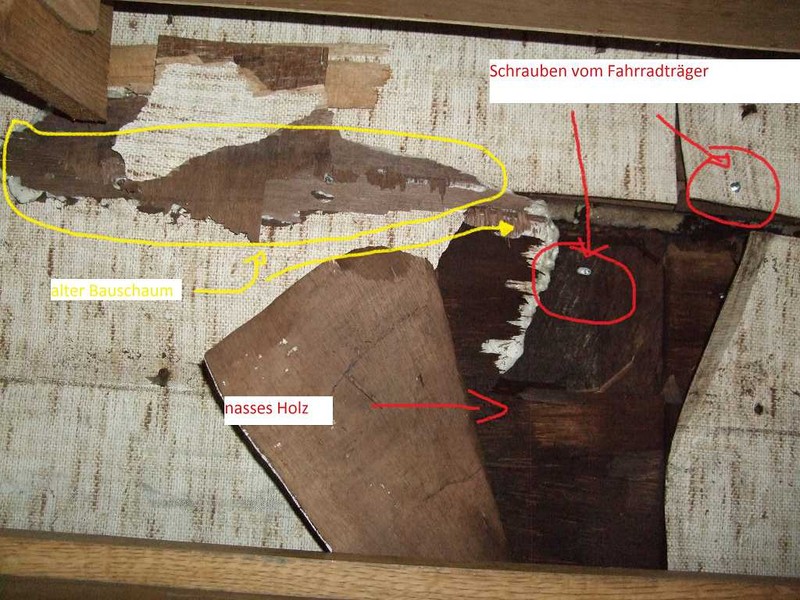 Hallo zusammen, bin neu hier! Bin seit 1 Monat Besitzer eines Fiat Ducato Hymer Eriba Camp 55, Baujahr 1985. flotter 92PS Austauschmotor tuckert im Inneren. Während unseres ersten Urlaubs mit dem Womo in Griechenland (war wunderschön, wir sind seit 7 Tagen zurück) hatten wir einmal duzchgehend 3 Tage schwere Stürme mit viel Regen, dabei ist uns aufgefallen, dass an der Unterseite des rechten Fensterrahmens an einer Stelle (sehr wenig) und an zwei Stellen an der Unterseite des hinteren Fensterrahmens (etwas mehr) Wasser reindrückt (siehe auch Fotos). Hat jemand Erfahrungen damit und kann mir sagen, wie ich das am besten in den Griff kriege. Bin totaler Womo Neuling. Muss ich einfach den Gummi nur reinigen oder gleich auswechseln? Oder von aussen abdichten? Das grössere Problem ist, dass unter der Theke an der Rückseite (siehe Fotos) ein wohl schon seit längere Zeit vorhandener Wasserschaden ist. Es schein, als ob durch die Schrauben des Fahrradträgers Wasser nach innen drückt (siehe Fotos). Der Vorbesitzer hat da auch schon mit Bauschaum gebastelt. Wie würdet ihr vorgehen? Ich möchte gerne erstmal nur mit so wenig Aufwand wie möglich ran: Fahrradträger abbauen, die Löcher dicht und dann versuchen das ganz über den Winter trocken zu kriegen. Denkt ihr das ist machbar? Und wie groos ist der Aufwand die hintere Theke auszubauen (falls ich doch "richtig" ran will)? Und ist hier irgendwer aus dem Raum Freiburg, mit dem man sich vielleicht sogar mal treffen könnte, um Tips und Hilfe vor Ort zu kriegen? Ich bin über jegliche Hilfe und Anregung sehr dankbar. Nimm am besten kontakt mit Turbo Kurtla auf,der ist der absolute Fachmann und kann Dir am ehesten helfen. Arno Tag Zuerst sollten mal Bilder von innen und außen hier reingestellt werden, dann kann man was dazu sagen. Kurt danke für antworten. ich bin noch nicht lange genug mitglied, um fotos einzustellen. das andere forum in dem ich den gleichen beitrag mit bildern habe darf ich namentlich nicht erwähnen. werde mal schauen ob cih irgendwo noch bilder hochladen kann. Turbo Kurtla: was für bilder bräuchtest du denn am besten, um das ganze zu beurteilen? so jetzt klappts auch mit fotos. falls noch mehr gebraucht werden mach ich gerne! ![]() ![]() bisher wurde mir wegen den fenster empfohlen, diese komplett auszubauen (also die Fensterrahmen), dann mit Dekalin abzudichten. Kann ich den Wasserschaden unter der Theke erstmal "minimal-invasiv" behandeln? Ich dachte, ich kann evtl. den Fahrradträger abbauen, von aussen abdichten und versuchen das Gedönse innen zu trocknen. Würde das klappen, oder sollte ich eher die Theke innen wegnauen, um richtig ranzukommen. Wie kompiziert ist der der Abbau der Theke, mit kühlschrank Herd und allem drum und dran? Hier noch ein Bild von aussen: ![]() Moin Also um so nen Schaden zumindest mal grob einschätzen zu können braucht es mehr wie solche Detailbilder. Wie nasses Holz ausschaut weiß ich, aber ich weiß nicht wie es drumrum ausschaut oder wo das Wasser herkommt. Ohne diese "Theke" gesehen zu haben kann da keiner was dazu sagen. O.K., eins ist klar. Wenn man es anständig machen will, muss man auch überall gut hinkommen. Also muss alles weg. Außen ists ähnlich, Du zeigst hier ein Detailbild der unteren Trägerhalterung. Man sieht zwar, dass da jemand schon mal was dran gemacht hat, aber warum und woher. Keine Ahnung. Innen: Zumindest ein Bild, auf dem man die komplette innere Aufteilung sieht. Noch besser wäre zur Ursachenforschung, wenn die Wand freiliegt ( muss eh ab ), also ohne Dekor, und man den Wasserverlauf sieht. Außen : Ein Bild, auf dem das ganze Heck mit allen Anbauteilen zu sehen ist. Wasser kommt von oben also muss man sehen was da dran ist. Kurt Danke Kurt! 1. Ich habe heute erfahren, dass der Fahrradträger irgendwann in den 90zigern mal abgerissen war. Wie, weiss ich nicht. Daher wohl auch das Gebastle mit dem Bauschaum. 2. Ich habe noch ein Foto von der Rückseite im Ganzen gemacht + ein Foto der Küchenzeile an der Rückseite, an der der Wasserschaden ist. Vielleicht kann mir ja jemand sagen wie aufwendig es ist so was auszubauen, da ich mit Technik nicht der Stärkste bin. Soweit ich es im Moment einsehen kann, kommt die Feuchtigkeit direkt von den Fahrradständerschrauben, darüber is kein Wasser ersichtlich. Kannst du mir sagen, ob die in einem anderen Forum vorgeschlagene Lösung zum meinen Problem mit den Fenstern sinnvoll ist (Fenster ausbauen, Rahmen abdichten)? Oder benötigt es dazu ebenfalls noch genauere Bilder. Falls ja, mach ich gerne. ![]() ![]() Was trinkst Du gerne? Hol es und lies. Also, die Fenster scheinen "nur" über die Außendichtung undicht zu sein. Gibt's neue Außendichtungen einzeln, sonst Fenster ausbauen und mit Dekalin neu eindichten. Keine Ahnung wie? Hersteller oder Fensterhersteller anrufen! HINTEN? Ja, da ist wohl Arbeit angesagt, aber keine Angst. Die Küchenzeile hat innen Plastikabdeckungen, darunter sind Schrauben, vorher Gas schließen! Nun Schrauben rausdrehen und schon hast Du den Küchenblock in der Hand. ALLES was nun beim klopfen nicht nach Echo, sondern stumpf anhört mit einem Tapeziermesser großflächig rausschneiden. besser etwas mehr. Bis nur noch trockenes da ist. Holz nass, ersetzen, großflächig. Zwischenräume mit Sterodur, genau, füllen. neue Innenwand ankleben oder schrauben. Klar, dazwischen mit Lüfter trocknen! Aufwand: 2 WE, Kosten: 40-50 €. Rolf Noch ne Frage: Sind die Ecken des Unterbodens hinten rechts und links weich ? Schau sie aber genau an, nicht das da schon mal ne Platte drauf gemacht wurde. Und, was sind das hinten für Punkte über dem braunen Streifen ? Ist da ne ne Leiste dran die den Übergang Dachblech/Heck abdeckt ? Ich seh nix. Kurt Schönene Dank nochmals for alle dir mir hier helfen wollen. Zu Kurts Fragen: 1. Die Ecken des Unterbodens sind für mich schwer zugänglich, da in der linken Ecke der Kühlschrank und in der rechten Eck das Bad sitzt. So weit ich dort tasten konnte, s