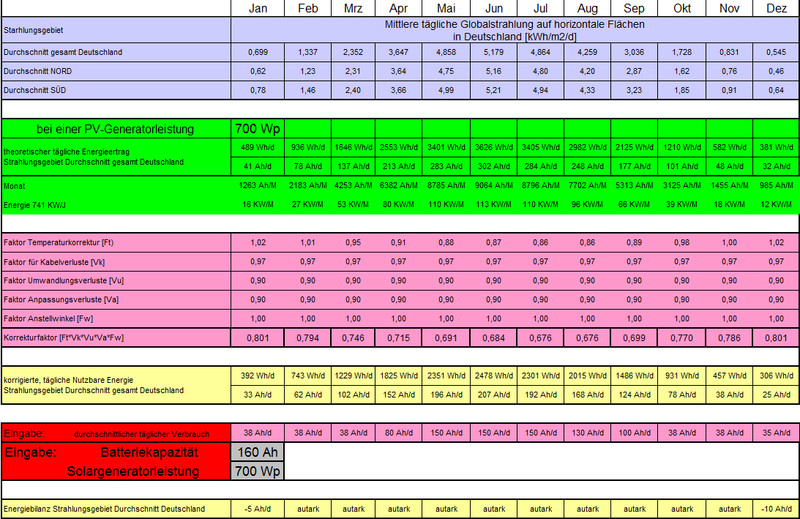 Hi Christian, bei 160 € Differenz wird das aber nur eine kurze Reise. Ich hoffe Deine AGM's mit den vielen Winner-Werbeversprechen halten lange, sonst bin ich wieder im Plus. Uwe Wir haben 700 Wp und 180 Ah Gelakkus als Speicher. Auf dem Foto kann man gut sehen was wie lange reicht. ![]() Wer selber nachrechnen will kann -->--> Link Servus, ich habe die weissen Modulhalter verbaut. Würde ich nicht mehr machen. Teuer und kritisch in der Verarbeitung. Jetzt würde ich einfache Aluleisten verwenden. Viele Swoni Hallo biauwe, klasse Tabelle, wenn die Module flach auf dem Dach sind denke ich wird der Korrekturfaktor für den Anstellwinkel nicht hinhauen. November bis Januar muß ich zu Hause bleiben oder mindestens 1 Stunde fahren. Uwe