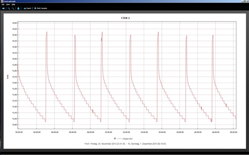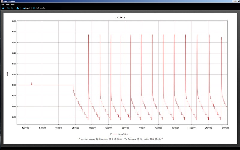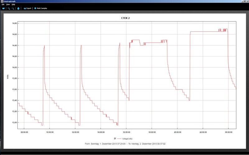 ha ha Witz der Woche........ Ein" Netter" hat mir dieses per PN erklärt, aber erst auf meine Frage hier. Aber du siehst ja, anscheinend ist das auch nicht korrekt. Aber was ist jetzt richtig? Stelle hier Fragen, die ich nicht weiß und was auch noch mit dem Thema Womo zu tun hat............. :D Da mein Womo von Dez. bis März im Freien im Winterschlaf steht, hab ich die Kabine die ganze Zeit über an 230 Volt hängen. In der Kabine ist ja werksseitig ein Automatik Ladegerät verbaut. Wenn kein Schnee auf dem Dach ist, wird die Batterie (Säure) ja von der Solaranlage 2 x 100 Watt Paneele geladen. Bis jetzt gab´s nie Probleme mit der Batterie. Sie ist seit Februar 2009 verbaut. Peter vom Chiemsee wir haben kein solar verbaut, also würde es reichen wenn wir 1x die Woche 230V anschließen? Wenn keine Verbraucher versorgt werden reicht auch 1 x im Monat Hallo, mal zwei laienhafte Fragen eines elektrotechnisch Unwissenden: - wenn Laika kein EBL verbaut wie laden Deine Batterien bei Landstrom, immer mit Schnellladegrät? Ist das bei Laika usus? - was spricht dagegen, das Womo permanent am Landstrom zu lassen? Ich habe mein Womo in einer Halle abgestellt, seit 01.12. bis Ende März. Hängt dort permanent am Landstrom. Ich habe aber EBL. Ich habe zuhause mal ein Messgerät dazwischen gehängt. Wenn das Womo an den Landstrom geht nach längerer "Abwesenheit", dann zieht das Teil in den ersten Stunden mehr, dann fällt der Wert rapide ab, und hält sich dann konstant niedrig, also für mich dann "Erhaltungsladung". Dieter Hol Dir nen guten Automatiklader, mit Gel- Kennlinienmöglichkeit. Cetk hat da einiges gutes, auch bezahlbares im Programm. Das Beste was es gibt, um den guten Gel´s das Leben zu verkürzen. gr mani Also, ein Schnellladegerät tut keiner Batterie auf Dauer gut. Ich benutze diese Funktion in den seltensten Fällen, auch nicht bei der Starterbatterie. Langsam laden mit niedrigen Ampere ist am optimalsten, dann hält die Batterie um einiges länger als wie oben gesagt. Das wird Dir jeder Bosch Dienst bestätigen. Da mein Womo erst wieder im April zum Einsatz kommt, habe ich die Starterbatterie abgeklemmt. Kurz bevor ich das Womo wieder fahre, lade ich die Batterie für 12 Stunden. Das hat bis jetzt immer gut funktioniert und der Motor sprang auch sofort an. Peter vom Chiemsee Hy, um mal ein wenig Licht ins Dunkel zu bekommen, anbei die Log-Daten meines CTEK MX 4003 an insgesamt 195 Ah (zwei offene BS). Nach knapp 7 Tagen in der Erhaltung fängt das CTEK die sogenannte "Pulsladung" an. Das heisst, es geht nach der Erhaltung in Stand-by & überwacht die Ruhespannung der Batt. Sobald diese auf 12,95 V abgefallen ist, wird kurzzeitig nachgeladen & das Gerät geht wieder in den Stand-by Modus. Hier gut zu sehen, das den Tag über 13 kurze Ladeimpulse erfolgen: ![]() Nach einigen Tagen ist die sind die Batt. soweit zu 100% geladen, das über 24 Std. nur noch 7 Ladeimpulse stattfinden ![]() Nach weiteren Tagen erfolgt ein kpl. Neudurchlauf der Kennlinie. Gut zu sehen, das die Spannung in der Hauptladephase auf den max. Wert steigt & dort für knapp 3 Std. verharrt. Danach fängt die Erhaltungsladung an und der ganze geht bei Bild 1 wieder von vorne los. Warum er zwischen 16 & 23 Uhr so rumeiert? Keine Ahnung. Könnte eine interne Zwischenmessung sein. ![]() Übrigens....das "Pulsen", mit dem CTEK wirbt, hat in keinster Weise etwas mit der Arbeitsweise eines Batteriepulsers (z.B. MEGAPULS) zu tun.