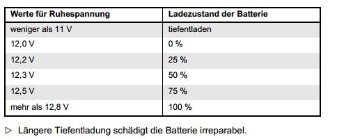 Stimmt.....grade die GEL benötigen eine längere Hauptladephase. Je nach Ladegarät & dort hinterlegter Kennlinie werden Deine veranschlagten 7 Std. nicht ausreichend sein. Ein weiterer Punkt sind die derzeitigen Aussentemp. u.U. werden sie somit noch nicht einmal vollgeladen. Bei dem Batt.-alter sollten sie für einen längeren Zeitraum (in Ruhe) bei ~12,9 V dahindümpeln. Ich habe ein schnellladegrät, aber gut das kann ich ändern. Reicht dann einmal die Woche? Hallo Kai, mich wundert immer wieder mit welchem Vertrauen an das Forum hier Fragen gestellt werden die sicher und zuverlässig, genau auf deine Akkus abgestimmt, in der Gebrauchsanleitung oder über die Hompage des Herstellers beantwortet werden können. Ich unterstelle mal, das nicht wenige Antworten deinen Akkus mehr schaden können ( Schnellladegerät :twisted: ) als dir oder besser deinem Geldbeutel gut tun. MfG kheinz