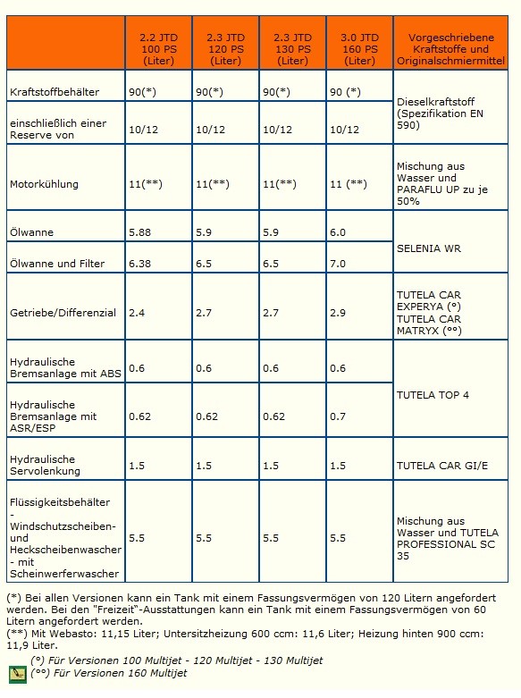 kurze Frage, mein Womo ( EZ 3-2012 ) hat jetzt 46tkm gelaufen, letzter Service war im März 2013. Werde wohl im März Service machen müssen. Welches Öl nimmt Fiat für mein Motor? Und wieviel Liter.