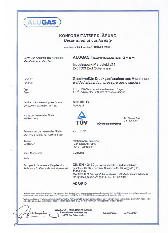 Anbei eine Kopie der "Konformitätserklärung", falls die Tankflasche keine eingestempelte CE Nummer nach DIN EN 13110 hat. Im unteren Drittel steht (eigentlich)auch die Serien.Nr. der Tankflasche zur Identifikation. Mein Gasprüfer bestand auf dieses Dokument. (Hallo Scout, die Suche hat mich 1h gekostet, jetzt habe ich es eingescannt) Andreas