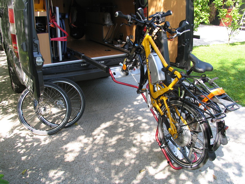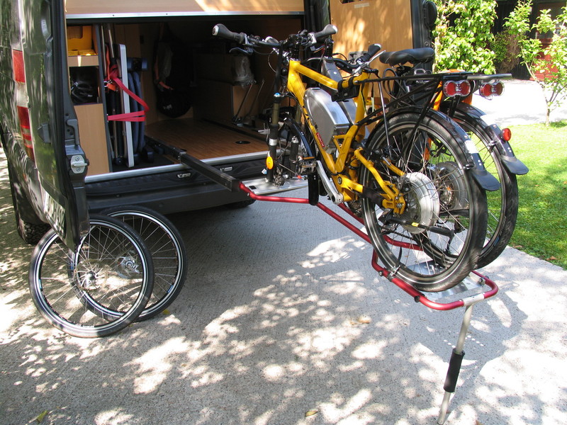 Mittels Fahrradträgersystem einer bestimmten Fa. (ich bin noch unsicher, ob hier Namen genannt werden dürfen bzw. der Link der Fa. eingestellt werden darf) in Kombination eines von mir entwickelten Aluminium - Gleitschienensystem können die Pedelecs ganz bequem aufgefahren und außerhalb des Wagens aufgebockt und verzurrt werden. Die Vorderräder werden in einem Halter einer weiteren, bestimmten Fa. abgesetzt und ....fertig zum Einschieben. Das System ist so konstruiert, das die Laufrollen des Fahrradträgers bei Volleinschub in der Aluschiene einrasten, sodass die Pedelecs absolut fest stehen und nur noch im Bereich des Wagenhecks mit Gurtband gesichert werden können (nicht müssen).
