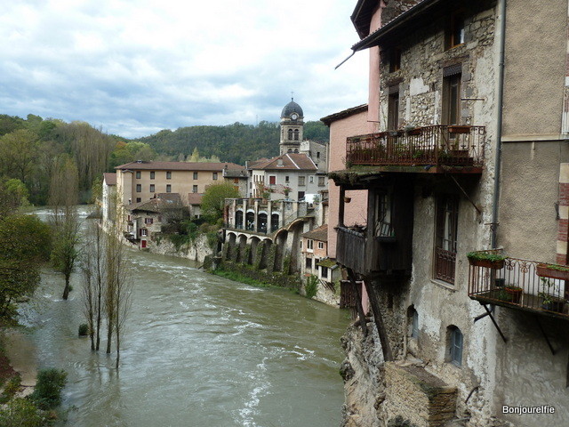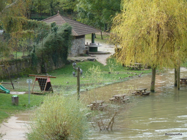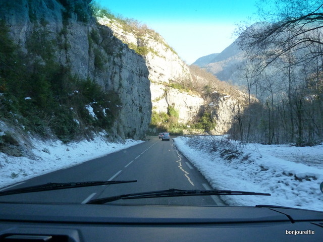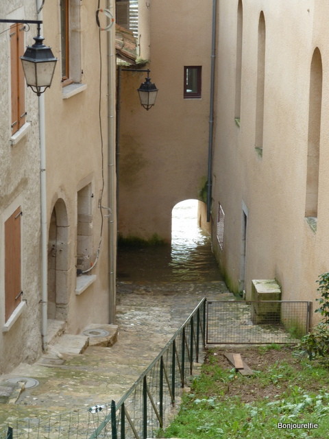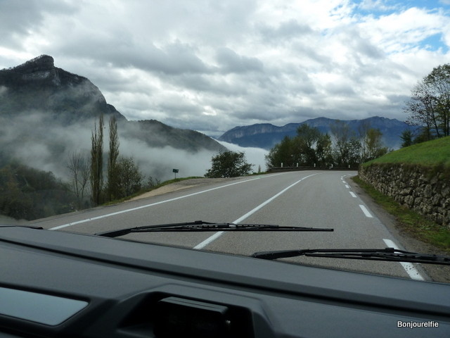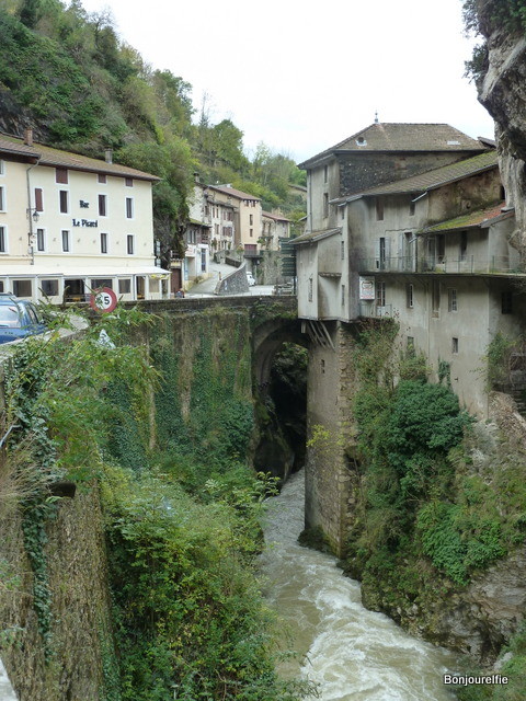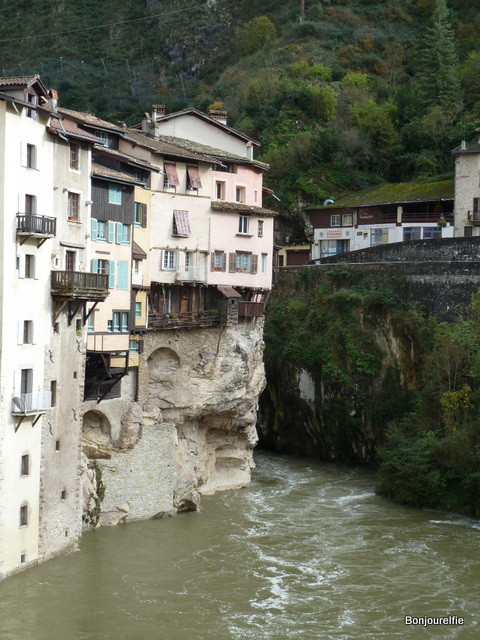 Durch den Naturpark Chartreuse kommen wir ins Tal der Isère.So ein richtiges Ziel für den heutigen Tag haben wir eigentlich noch nicht, so ist das eben, wenn man einfach drauf los fährt. Aber irgendwann gegen Mittag sehe ich in der Karte den Ort Pont-en-Royans, mit einigen Sternchen versehen, da muss also etwas Interessantes sein, und er liegt nur einige Kilometer abseits unserer Straße. Eine sehr schmale Straße führt ins Gebirge, Baustellen und ein einspuriger Tunnel machen es nicht leichter. Ich habe einen guten Riecher. Der Ort liegt am Fluss Bourne, der sich an dieser Stelle canyonartig eingeschnitten hat. Er hat gerade Hochwasser, die untere Promenade und etliche Bäume und Picknickbänke stehen unter Wasser.