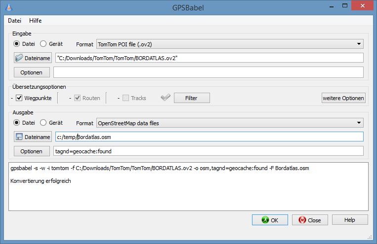 47 36 11.3n 10 11 17.9e Hallo, ich habe auch das Nokia Lumia 620 Handy und benutze auch das Here Drive von Nokia. War damit in Deutschland, Italien, Schweiz, Frankreich. Hat sehr gut funktioniert. Karten gibt es Weltweit und sind kostenlos. Auch die Geschwindigkeitsanzeige ist sehr brauchbar (mit Warnung bei Überschreitung der Geschwindigkeit) vor allem in der Schweiz, denn da sind die Strafen teuer. Bernd Hallo Honshu, ich nutze das iPhone 4s mit 64GB und CoPilot Premium HD Europa und bin absolut zufrieden mit der Kombi. Schau dir mal meinen Thread an --> Link , da erkläre ich wie sogar unter iOS, Poi´s Intrigiert werden können :mrgreen: Markus Hallo liebe Navigierer melde mich unter dem ernormen Infodruck :idea: und muss erst mal über alles nachdenken und vorallem testen, wie es mir persönlich am besten passt. Aber vielen Dank schon einmal für Eure Zeit und Mühe. aus Würzburg Hallo, hier habe ich eine Anleitung gefunden, um eigene Pois z.B. Bordatlas in Osmand zu integrieren: --> Link Mit dem Programm GPSBabel habe ich die Bordatlasdatei von TomTom in eine . osm Datei umgewandelt und anschließend mit dem OsmandMapcreator in eine .obf Datei gewandelt. Die dann in das Osmand-Verzeichnis kopiert. Diese sind dann mit dem angezeigten Beispiel im Geocache-Verzeichnis zu finden. Hier mal ein Bild der Einstellung in GPSBabel: ![]() Benutzt keiner von euch die APP Navfree auf Android? Kostet nix und bietet kostenlose Karten ... habs mal downgeloadet aber noch keine Erfahrungen damit .... Bye, Ralf |