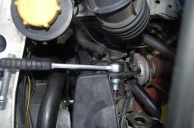 2. Als nächstes muss der Keilriemen entspannt und vom Antriebsrad der Unterdruckpumpe abgenommen werden. Dazu stecken wir die 3/8 Zoll Verlängerung mit der Ratsche in das Vierkantloch des automatischen Keilriemenspanners und drücken nach unten. (zum Boden)