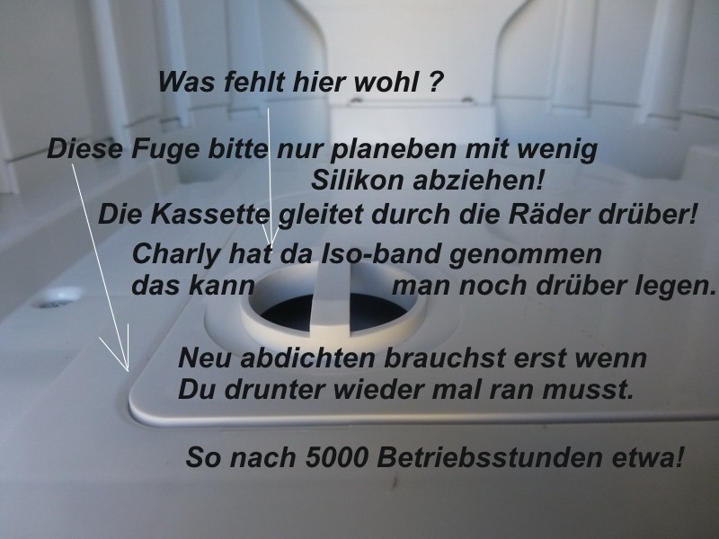Was sagt denn die "Kassette" zu dem "ein wenig Sili", die man ja regelmäßig raus und dann wieder rein schieben muß ? Regelmäßig "Sili", na ich weiß nicht, mein Ding wäre es nicht. Wo findet sich die ein "ein wenig Sili" dann wieder ? Den schwarzen Dichtungs-Ring konnte ich gestern anläßlich einer Werksbesichtigung nirgendwo sehen, als ich diese Problematik angesprochen habe .