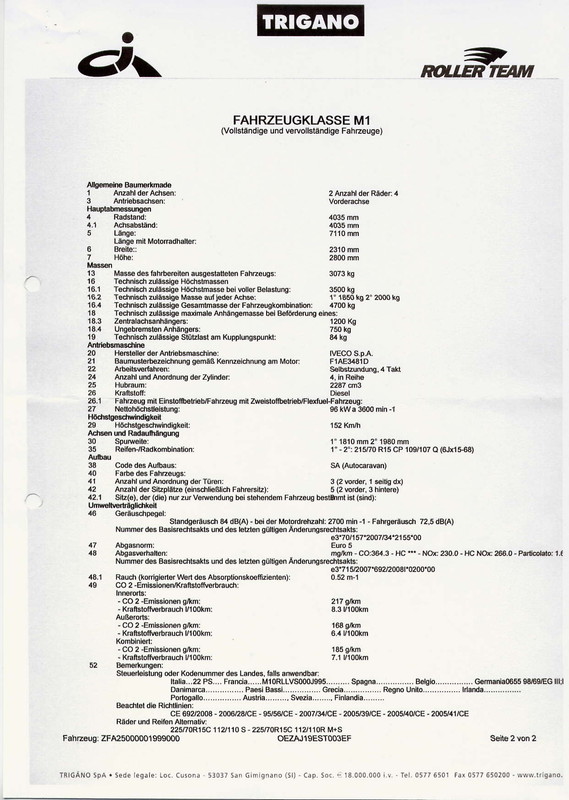 Wenn DAS die CoC ist, mit der die Abnahme beim TÜV verweigert wurde: 225er montieren und Kopie dieses Zettels mitführen. Ziffer 52 sagt eindeutig : 225/70 R15 Wenn es beim TÜV nur nicht eingetragen wurde ist alles in Ordnung - Reifengrößen Werden heutzutage nur noch eingetragen, wenn sie NICHT im CoC vermerkt sind (d.h. Einzelabnahme). Ansonsten kann ich 225 wegen höherer Traglast, niedrigerem Luftdruck (der abhängig von der tatsächlichen Rad / Achslast eingestellt werden muss, auch wenn hier immer noch einige meinen sie müssten auf Teufel komm raus den Maximaldruck reinknallen) und vor allem wegen besserer Fahrstabilität nur Empfehlen. Kein Vergleich zu den eigentlich fast immer überlasteten 215ern. LJS Long John Silver Beim Vorgänger ein Alkhoven verweigert ! Die COC ist Aktuell, Ralph Wenn die 225/0 R15C in der COC stehen heißt das dieses Fahrzeug ist mit den 225/70 R15C homologisiert, also beim Kraftfahrtbundesamt mit den Reifen abgenommen worden. Also aufziehen, fahren und sich freuen :) Ich habe immer eine Kopie der COC im Fahrzeug bei den ganzen anderen Papieren, man weis ja nie :?: Dieter 225/70R15C/CP 112S. Diese Reifengröße steht bei mir noch zusätzlich drin ( x250 Bj 2013; Sonst nichts). Also auch bei den Breiteren mit höheren Tragindex die CP Kennung u. das S steht für bis zu 180km/h. Das WoMo ist mit 135 km/h eingetragen. Möchte wissen was das soll? :vogel: Ende des Monats habe ich einen Termin beim Händler wegen einer Garantiesache, werde dann mal nachfragen. Wollt auch Winterreifen haben, u. die gibt es nicht als CP. Reifen in der Klasse bis 180 km/h sind auch nicht grade gut zu finden. :-? 225/70 R15 C 112 ist eine sehr gängige Lieferwagengröße - und die Burschen kacheln schon mal volles Rohr. Unter 3,5t zGG sogar legal. Gut eingefahrene Ducs mit großer Maschine und niedrigem Aufbau kommen schon mal an die 180 km/h dran... Interessant ist, dass manche Reifenhersteller eine 112S/116N - Kennung haben. Bedeutet: Bei Höchstgeschwindigkeit bis 150km/h ist der Tragfähigkeitsindex 116 - also noch ein paar kilochen mehr als die 1120kg bei 112. Ist aber wegen der Achslast und zGG unserer Womos nur akademisch interessant. LJS Ach ja: 225er CP Reifen in 15 Zoll braucht kein Mensch. Das CP Gedöns ist ein Zugeständnis an notorisch überladene 3,5t Womos. Durch eine steifere Karkasse kann der Maximaldruck bei den 215ern auf extrem unkomfortable 5,5bar angehoben werden wodurch sich die effektive Tragfähigkeit (über die "offiziellen" 1050kg hinaus) um geschätzt 100kg pro Rad erhöht, ohne allzu große Sicherheitsrisiken einzugehen. Vermarktet wird das Ganze dann als "besonders geeignet für längere Standzeiten"... ist aber Käse - nach drei Monaten haben CP Reifen genauso einen Standplatten wie jeder andere auch. LJS