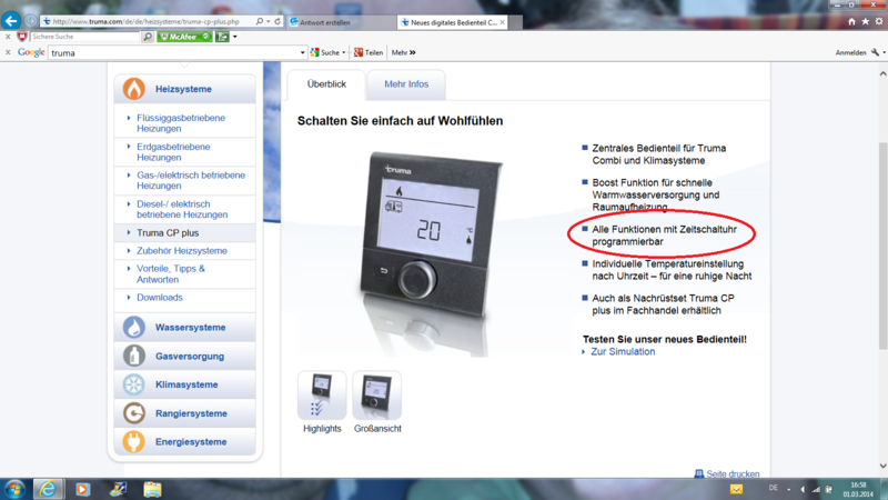 Hallo Dieter o.k. jetzt habe auch ich es verstanden. :oops: VG Uwe Hallo, keiner Antwoten auf meine Fragen? Oder kennt Ich das Teil so genau auch noch nicht? Ich würds halt gern einmal einstellen, weil im Urlaub der Tagesrythmus relativ gleich ist, d.h. ich brauche kein WW vor 8.00 Uhr, Heizung soll schon etwas früher hochfahren etc...... Dieter Hallo Dieter, Du kannst insgesamt nur eine Aus- und eine Einschaltzeit einstellen. Bei den was heutzutage ohne Mehrkosten, nur Softwaremäßig, möglich ist ist es schon sehr mager was das Trumateil kann. Aber immerhin schon ein Quantensprung gegen das einfache Drehteil. Dieter