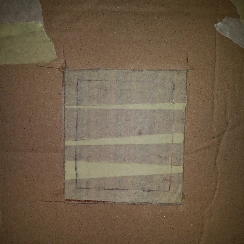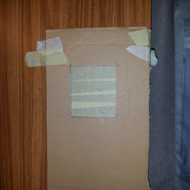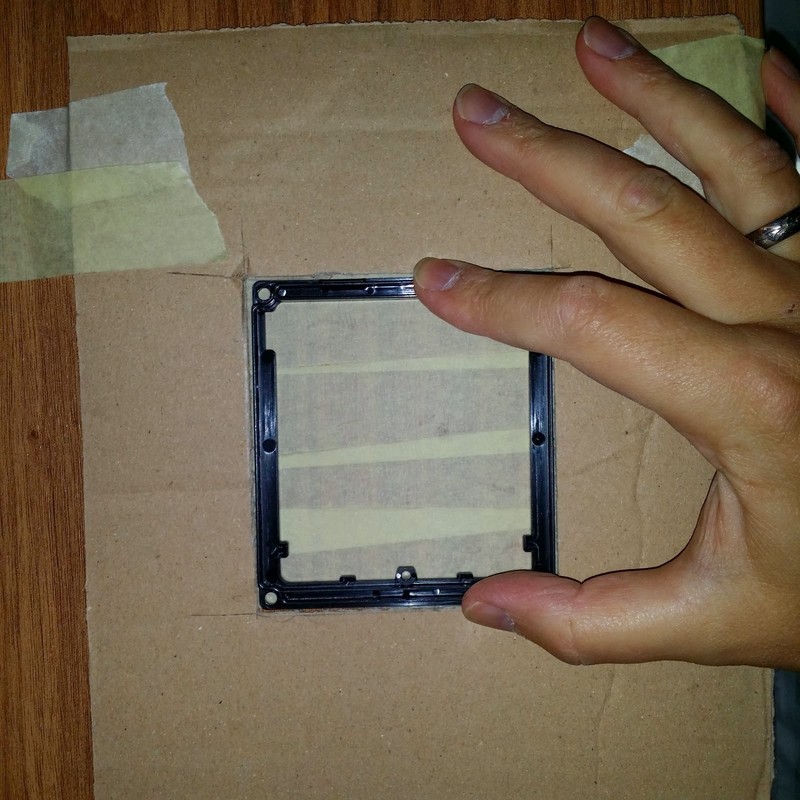 13. Montagerahmen der CP-Plus in den Pappausschnitt stellen und den inneren Umriß mit Bleistift auch das Kreppband übertragen. (Darauf achten, das der Rahmen gerade ist) In zwei gegenüberliegenden Ecken Löcher für die Säge bohren und dann den Ausschnitt herstellen.