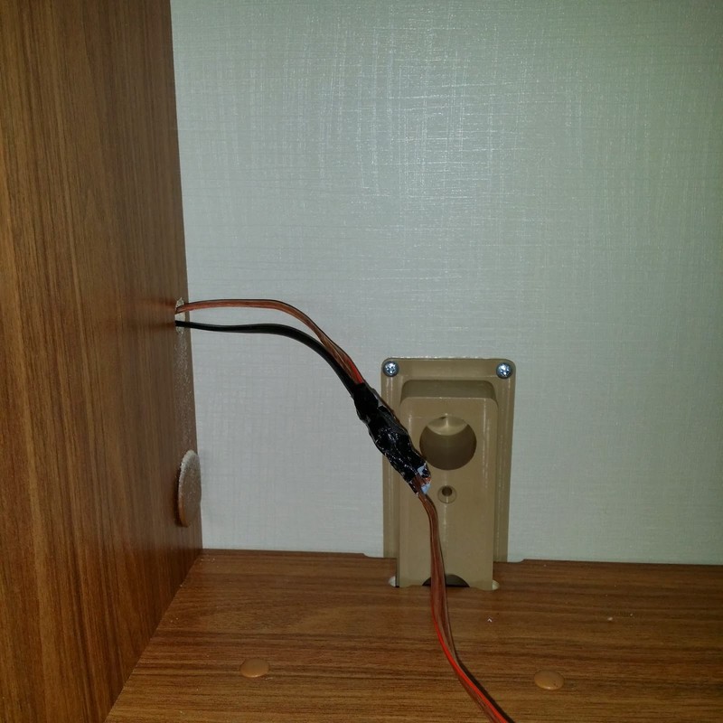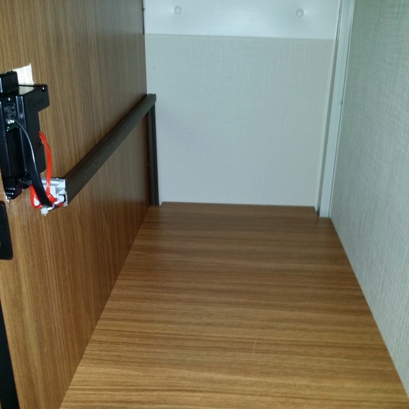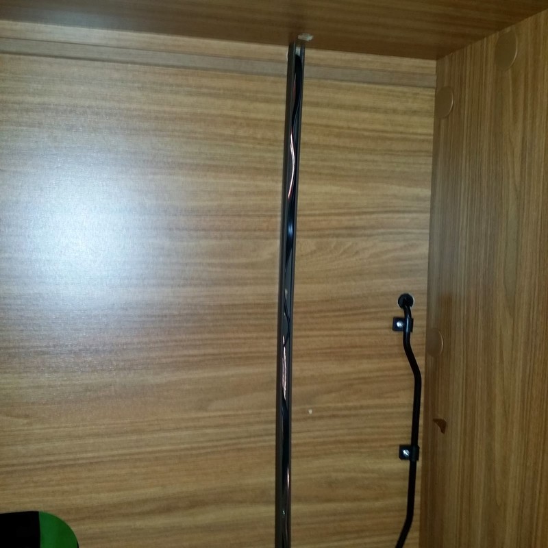 11. Nun die beiden Kabel (Steuerkabel, liegt der CP-Plus bei ) und das Stromkabel von der Heizungsseite durch das Loch am Bett schieben. Dann ein Zugkabel von der Schrankinnenseite Richtung Bett schieben und die beiden Kabel mit Panzerband an das Zugkabel kleben und langsam am Zugkabel im Schrank ziehen, bis beide Kabel im Schrank sind.