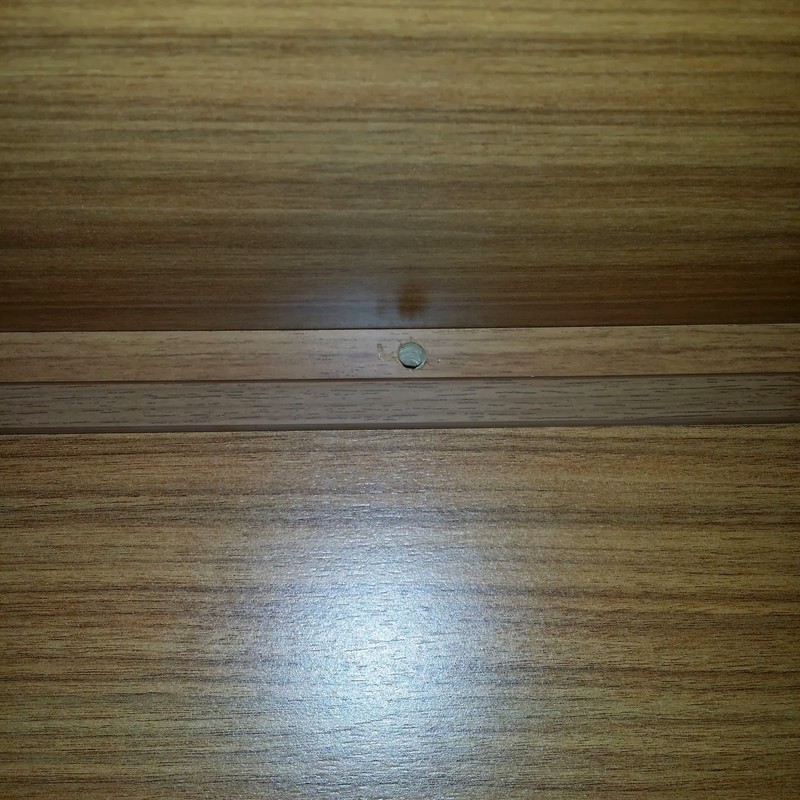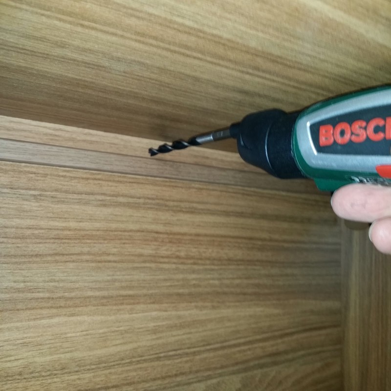 9. Die Tür am rechten Schrank und den Regalboden demontieren und das Loch im rechten Wandschrank Richtung Bett bohren.