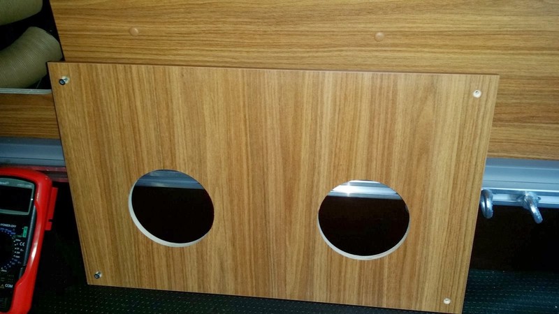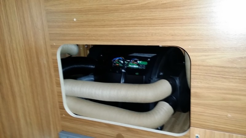 20. Den Regalboden im Schrank über der Heizung im Durchmesser des Kabelkanals ausschneiden und im Schrank einlegen. Jetzt die beiden Sicherungsschrauben für den Regalboden und die Holzabdeckung für die Heizung in der Heckgarage monieren. GESCHAFFT!! :tanz:
