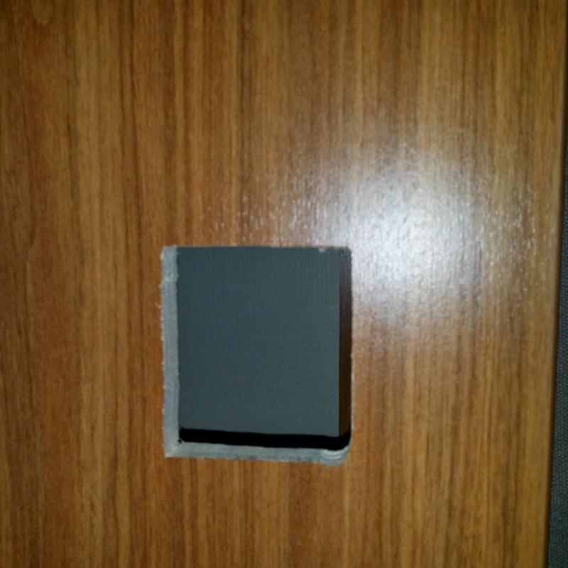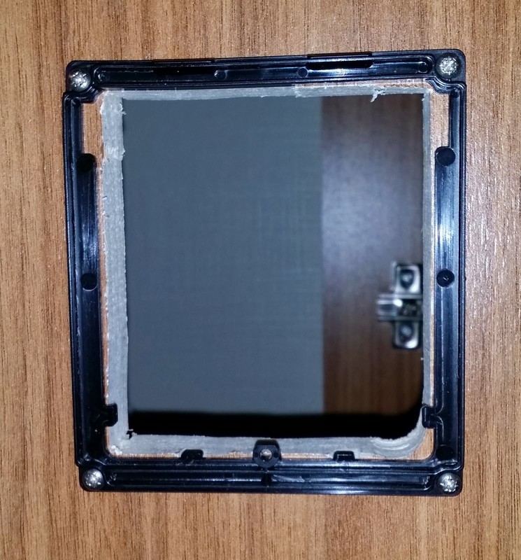 12. Den Montagerahmen der CP-Plus auf ein Stück Pappe legen und den äußeren Umriß anzeichnen und die Pappe mit einem Teppichmesser ausschneiden. Das Furnier am Schrank in der gewünschten Position der CP-Plus mit Kreppband abkleben, damit das Furnier beim aussägen nicht ausreist. Jetzt die Pappe mit Kreppband fixieren. Die Pappe verhindert, dass die Stichsäge beim sägen Dellen in das Holz schlagen kann oder das Furnier verkratzt.