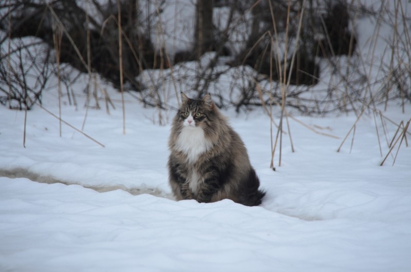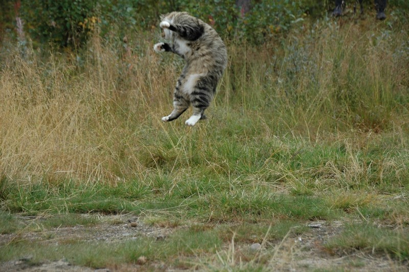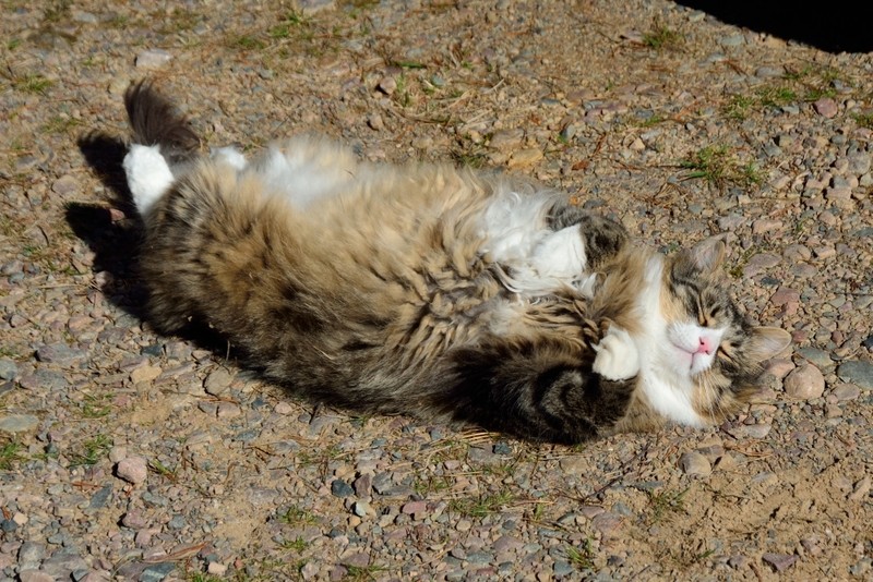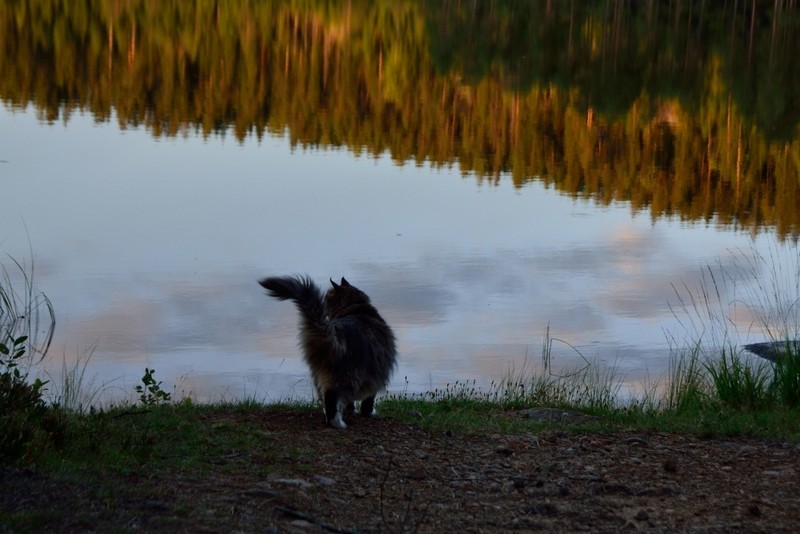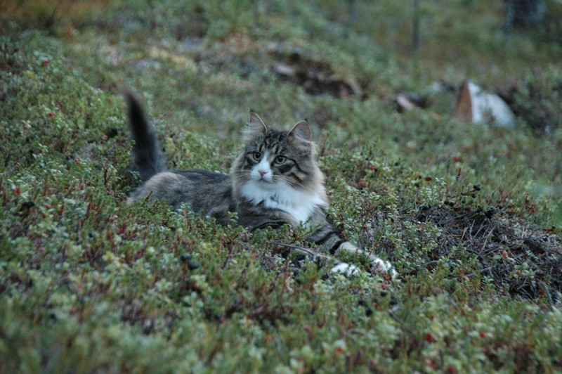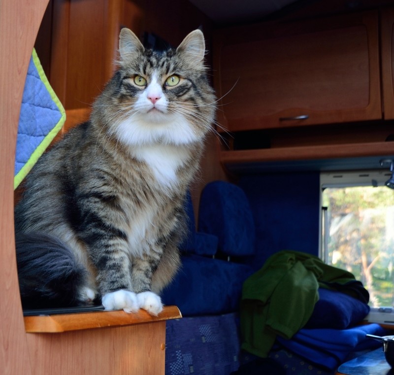 Wir reisen schon mit der zweiten Katze im Womo und Gimli genießt es sehr, wenn er endlich mal wieder richtige Wälder erkunden kann. Gimli ist absoluter Freigänger, hat zu Hause und im Womo eine Katzenklappe und ist nach Katzenart eher nachtaktiv. Zu Hause hat er schon sein Revier, in dem er auch Chef ist, aber er mag es auch, in der nordischen Wildnis herumzulaufen. Unser Reiseziel ist Sommer wie Winter der Norden (Schweden und Norwegen), wobei wir unsere Stellplätze so wählen, dass wir immer etwas abseits stehen und neben dem Womo ein Gebüsch oder Wald beginnt, also genügend Deckung vorhanden ist. Wir stellen uns nie an eine befahrene Straße, in direkte Nähe von Hunden (wobei die ja nachts schlafen) und ungern neben einen Bauernhof, weil da der Stress mit Katzen, die das Revier für sich beanspruchen, vorprogrammiert ist. Die meisten Plätze, an denen wir während der Fahrt zum Polarkreis stehen, kennt Gimli schon. Wir machen die Tür auf, er guckt sich um und schon verschwindet er immer in die gleiche Richtung. An Plätzen, die er noch nicht kennt, wird erst mal beobachtet und dann langsam der Radius vergrößert. Zur Sicherheit trägt Gimli im Urlaub ein Halsband mit einem Sender, sodass wir ihn notfalls anpeilen und finden können, haben wir bisher aber nie ernsthaft gebraucht. Morgens ist er immer im Womo und schläft schon wieder.