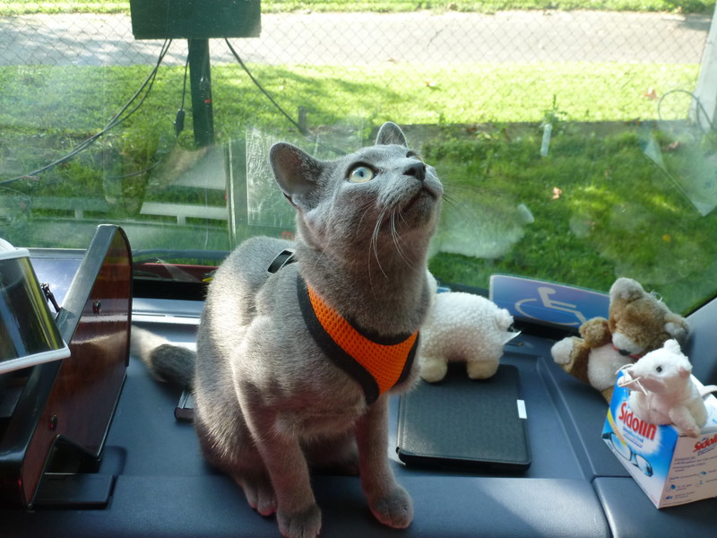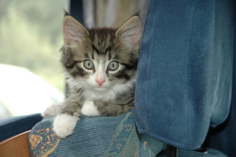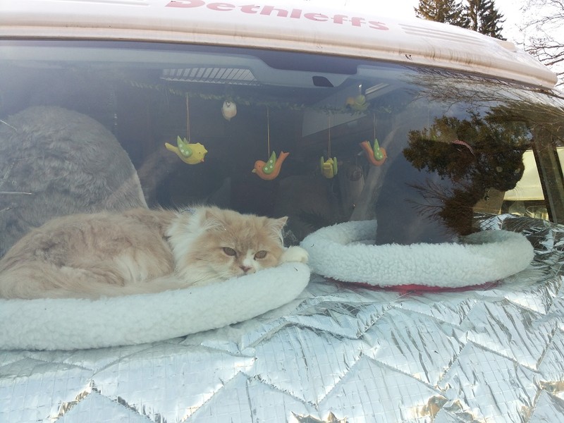 Unser Plüschvieh ist eine kastrierte 10 Jahre alte Katzedame, und fährt schon seit sie klein ist, begeistert im Auto mit. Zuerst noch in unserem alten VW Bulli, mittlerweile in unserem kleinen Wohnmobil.