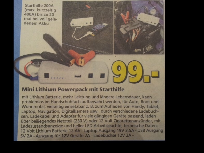so eine Starterbatterie ist ja nicht von ungefähr etwa fünf bis acht mal so groß wie dieses Spielzeug. Nintendo, i-Pad und Konsorten wird es laden können, aber keinen Dieselmotor starten. Dann kommt dazu eine gewisse Selbstentladung. Die soll bei Lithium-Ionen Akkus geringer sein, aber wenn das Ding zwei Jahre im Handschuhfach liegt und dann der Nofall eintritt, kann es auch mal nicht reichen. Und 200A zum Starten sind zu wenig, 400A reicht vielleicht, aber das macht das Ding ja nur kurzzeitig mit. Einem kleinen Kleinwagen kannst du damit vielleicht auf die Sprünge helfen, aber das wars dann auch. Im Laden lassen!