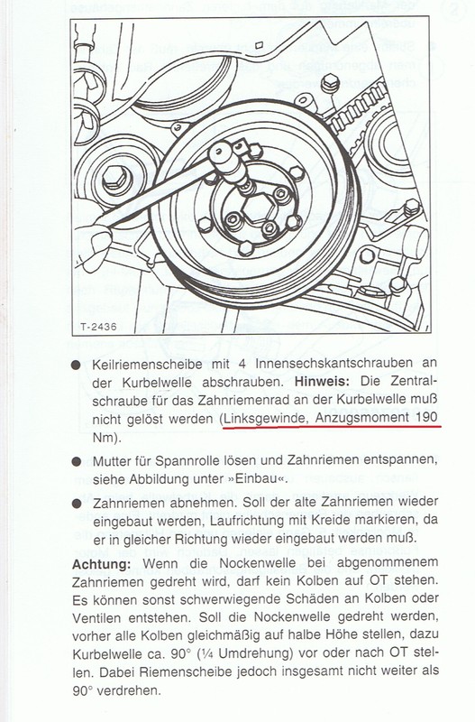 ich mach Loctite mittelfest dran. Aber die 190 Nm sind schon korrekt, oder gilt dieser Wert nur bei Linksgewinde, da sich da das Rad ja gegen die Schraubrichtung dreht? Dies geht aus dem Rep.-Buch nicht eindeutig hervor. Dort schreiben Sie beim 2,5 TD "Linksgewinde" Ich habe kein Linksgewinde und die Riemenscheibe ist auch anders als die abgebildete. Ich hoffe, der Auszug aus dem Reparaturbuch ist zulässig, ansonsten bitte löschen.