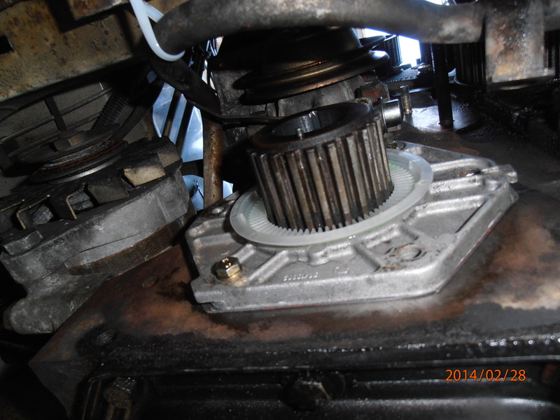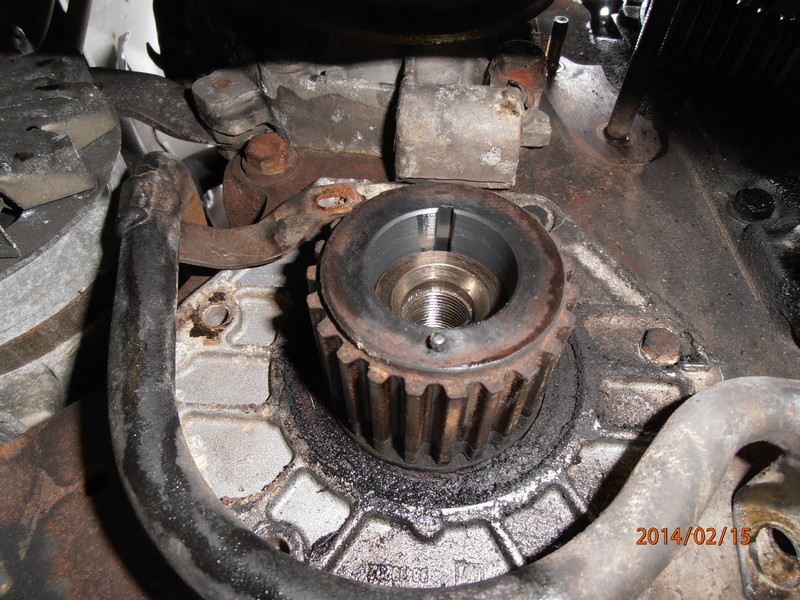 Ich würde da nicht mit dem Hammer drauf rum schlagen. Man sieht das die Welle nur mit einem Keil gesichert ist. Mit einer Abziehvorrichtung kommt man leider nicht weiter, da der Abstand des Zahnriemenrades zu klein ist. ( Abziehvorrichtung wäre der richtig Weg )