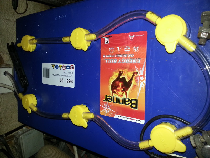 Ja, ein Mal Andreas ???? Ich les da 15A ... nicht AH!!! Nu ist sie da und verbaut - die Banner ist entlüftet :) Damit sind Gas und Elektro saniert - Wasser ist auch fertig. Jetzt geht's erst an Fahrzeugtechnik ( Zahnriemen/Wapu wechseln, Service machen und Bremskraftregler HA erneuern ), dann zum Karosseriebauer/Lackierer nach Kroatien. ![]() Nochmals danke für den Tipp mit der Moll Kamina Entlüftung!!! Servus, die Banner Energy Bull hat ja den Entgasungsanschluss an der Seite. Siehe auch --> Link Um den zu nutzen braucht man aber diesen Winkelanschluss. Hat jemand eine Ahnung wo man sowas kaufen kann? Bei der Batterie war er leider nicht dabei. mfg. Klaus Hy Klaus, schreibe Banner kurz an. Innerhalb weniger Tage wirst Du dann Post bekommen. :wink: Da hier die Frage / Info aufkam das es zu einer hohen Ausgasung mit dem Ctek Ladegerät und der Banner Batterie kommen kann hier die Info wie es jetzt bei uns ist: - Mehrfach auch für mehrere Tage am Netz gehangen und Ladung über Ctek ( 14,4V nach Anzeige auf Voltmeter ) Bisher konnten wir keine Ausgasung oder Wasserverbrauch feststellen. |