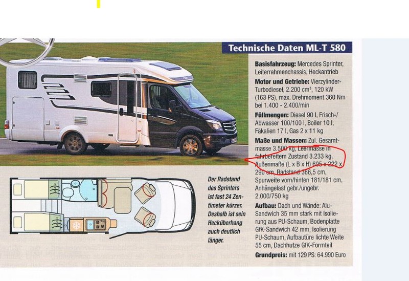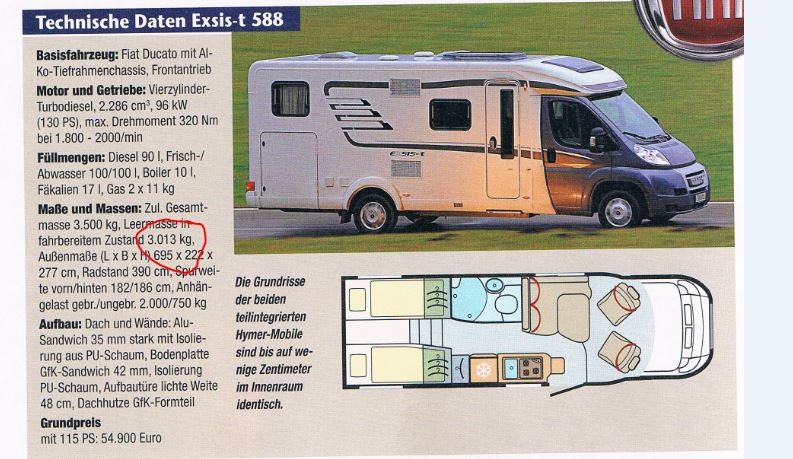 Mann hat geschrieben:....Das mit den 3,5 t ist mehr ein theoretischer Wert, das Teil wiegt knapp 3200 kg nackt. Der Stern Zuschlag beträgt übrigens 10 000€, der Hymer Exis-T auf Duc. ist wohl fast baugleich kostet 55000.