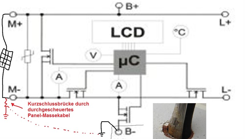 Als Fehler stellte sich ein am Dachblech durchgescheuertes Panel-Massekabel heraus, mit vollem Kontakt zwischen Panel-Massekabel und Fahrzeugmasse. --> Volle Panelladung ging ungeregelt in die Batterie. Fehler in der Verkabelung, Regler ist i.O.