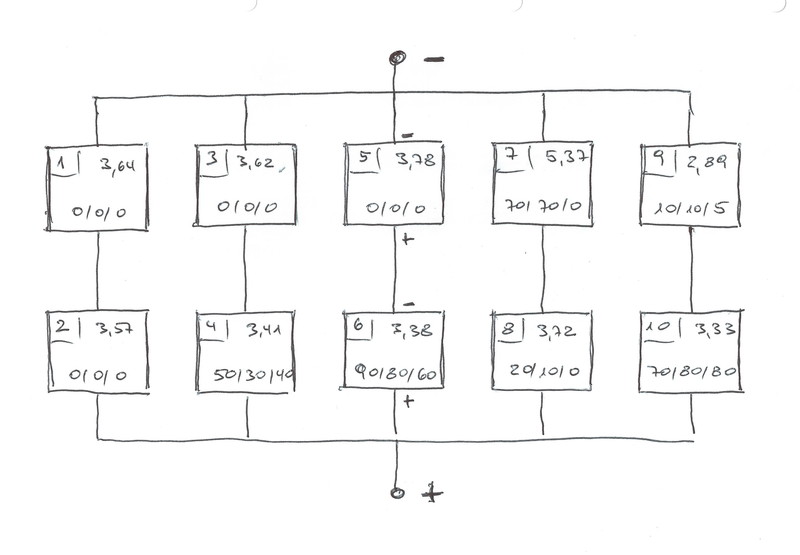 Mit der reinen Serienschaltung und 60 V war wie früher sichergestellt, daß nur ein Strom-Zweig besteht!! Zusätzlich konnte man direkt feststellen, wenn eine Zelle tot war.
