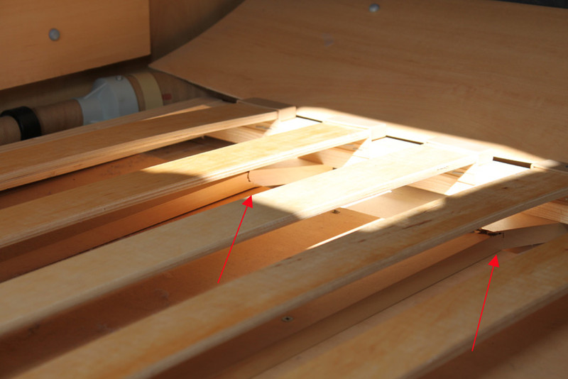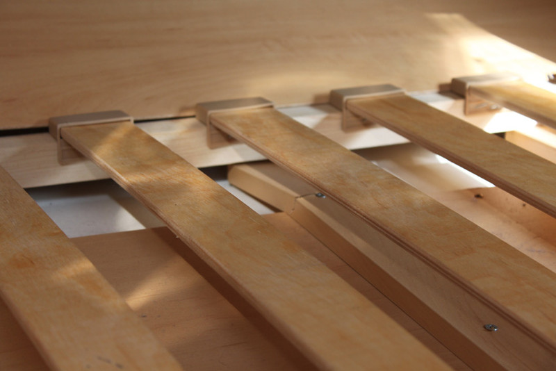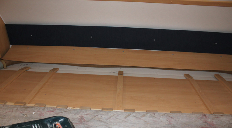 Das ganze ist schon konstruktiv etwas unglücklich gelöst, beide Lattenroste liegen nebeneinaner, der Lattenrost beim Wohnraum liegt ganz normal zwei mal seitlich auf, der vordere Lattenrost aber liegt nur an der Wohnraumseite auf, ganz hinten liegt er auf insgesamt 5 schmalen Querbrettern, wovon sich - wie wir jetzt entdeckt haben - 4 verabschiedet haben, also gebrochen sind.