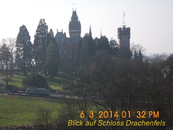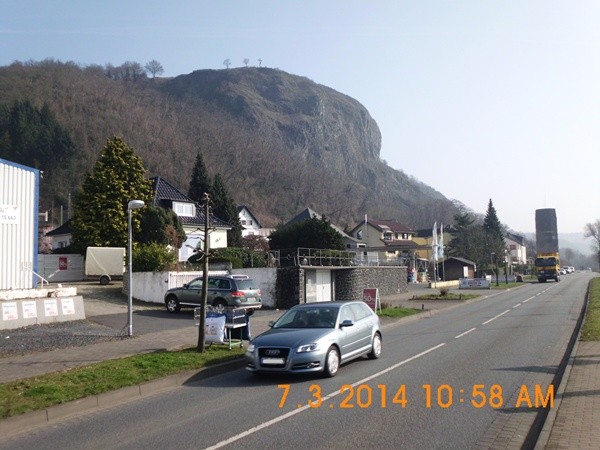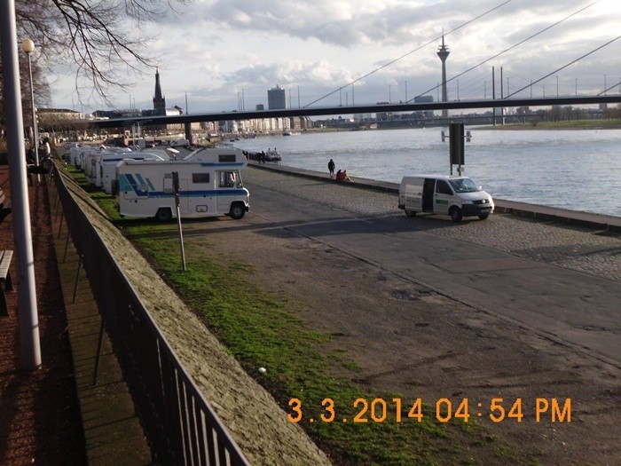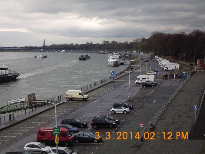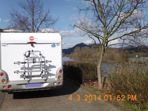 Nachdem ich am Kassenautomaten 24,-€ für 2 Übernachtungen ( 12,--€ je 24 Std.) bezahlt hatte, verließ ich den Stellplatz am Tonhallenufer. Es war an der Zeit, mal die WC-Cassette zu leeren und es wurde am Stellplatz darauf hingewiesen, daß die Entsorgung zu jeder Zeit am Messeparkplatz P1 am "Caravan-Center" möglich sei. Da ich mich ja als vielfacher Messebesucher in Düsseldorf bestens auskenne :D , fuhr ich natürlich gleich den kürzesten Weg am Rhein entlang zum Parkplatzgelände. Ich sah auch schon die Zufahrt zum Platz, ich sah aber auch noch ganz was anderes: Einen rot-weißen Balken, der etwa in Höhe der Motorhaube quer über die Fahrbahn angebracht war und mir somit die Zufahrt zu den Parkplätzen verwehrte. :( Also mußte ich das Mobil wenden, wieder ganz zurück und dann Richtung Kaiserswerth und über Stockum zum Messeparkplatz fahren. Gut, dass ich mich so gut auskannte! :D Diesmal erreichte ich auch das Caravan-Center, aber... och nööö... Da war doch dieses blöde Eisentor... verschlossen... und wie fährt man mit einem Wohnmobil durch ein verschlossenes Eisentor? Die Antwort: Es gibt zwei Möglichkeiten: 1. Volle Pulle mit Anlauf... oder 2. Gar Nicht! Ich entschied mich für letztere Möglichkeit, mußte halt die Schei... noch weiter mitfahren. :oops: Ich fuhr weiter, wieder zurück Richtung Rheinufer, dann durch den Rheinufertunnel in Richtung Neuss, überquerte den Rhein und gelangte auf der A 52 nach Dormagen. Dort fuhr ich von der Autobahn ab. Man will ja schließlich auch was von der welt sehen! Auf der B 9 gelangte ich nach Worringen. Kennt jemand Worringen? Was ist besonders an diesem Worringen? Nun eigentlich ist da gar nix besonderes. Ein paar Discounter an der Strasse, eine Tankstelle, linker Hand fließt der Rhein am Ort vorbei. Aber, es gibt in Worringen noch etwas, daß vielleicht der eine oder andere auch kennt. Es gibt dort einen Gebrauchtwagenhandel und dieser war schon mehrfach im RTL-Fernsehen zu sehen. Die Autohändler Jörg und Dragan. Neben deren Geschäft ist eine JET-Tanke und dort spendierte ich meinem Diesel neue Nahrung. Dann kam ich in die Nähe eines Ortes namens Köln. Es war Faschingsdienstag... und in Köln feiern die doch auch immer Karneval, oder? Viva Colonia und so. War bestimmt viel los in Kölle. Ich umfuhr diesmal die Domstadt westlich und kam durch die Müngersdorfer Sportanlagen nach Wesseling und weiter nach Bonn und Bad Godesberg. Auf einem Parkplatz am Rhein mit Sicht auf den Drachenfels bei Königswinter machte ich Mittagspause.