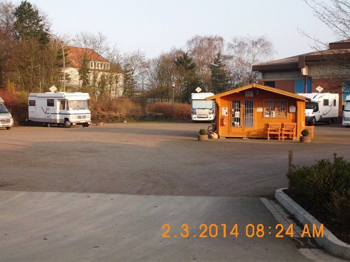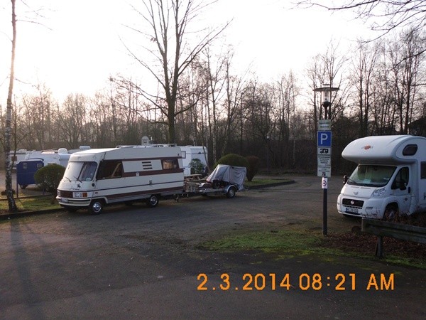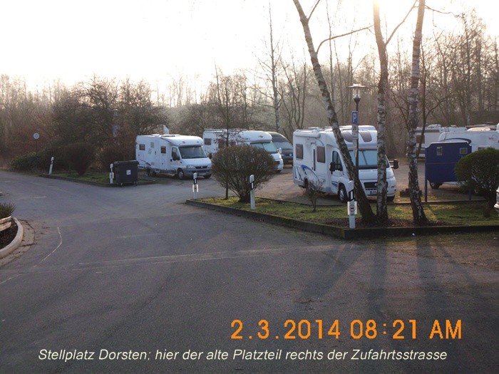 Nach fast 6-monatigem "Winterschlaf" stand die erste Reise des Jahres 2014 jetzt unmittelbar bevor. Das Wohnmobil, mein Bürstner "Solano T 650" stand fertig gepackt vor dem Haus. Nach einer letzten Mittagsmahlzeit zuhause mit den Eltern ging es dann um 11.30 am Samstag, 01. März, endlich los. Der Gasfuß juckte und zuckte. Zündschlüssel rum und wwwwuuuummmm. :ja: Wie befreit ertönte der Dieselmotor und trieb das Auto voran. Zunächst gelangte ich über Einbeck und durch den Solling nach Höxter an die Weser. Diese Strecke fahre ich bei Touren in den Westen immer, denn der Weg über Kassel auf den Autobahnen 7 und 44 ist kilometermäßig natürlich weiter und im Urlaub hat ja unsereiner viiiel Zeit. :D Ich überquerte die Weser und es ging weiter auf der B 64 vorbei an Bad Driburg nach Paderborn und nach einem kurzen Stop an der Wewelsburg --> Link Hier befindet sich eine Kriegsgedenkstätte, da mich solche Sachen aber nicht so interessieren, ging ich nur kurz zur Burg und fuhr dann weiter zur Autobahn A 44, Anschlussstelle "Bühren". Auf einem Rastplatz gönnte ich mir eine kurze Kaffeepause und schaute im Stellplatzführer nach einer Übernachtungsmöglichkeit noch vor Düsseldorf. Ich endschied mich für den Stellplatz in Dorsten am Wesel-Datteln-Kanal. Nachdem ich das Navi-Gerät mit den Daten dieses Platzes "gefüttert" hatte, lotste mich die nette Dame dann über Soest, Unna, das Autobahnkreuz "Dortmund/Unna, das Kamener Kreuz an der A 1, über die A 2 zwischen Recklinghausen und Gelsenkirchen entlang und dann noch ein paar Kilometer über Landstrassen nach Dorsten. Auch die Adresse des Stellplatzes fand das Navi problemlos. Der Platz liegt zwischen dem Fluss Lippe und dem Wesel-Datteln-Kanal an der Dorstener Eissporthalle.