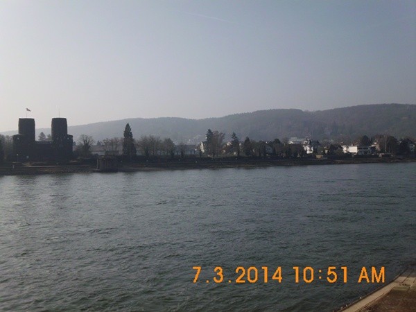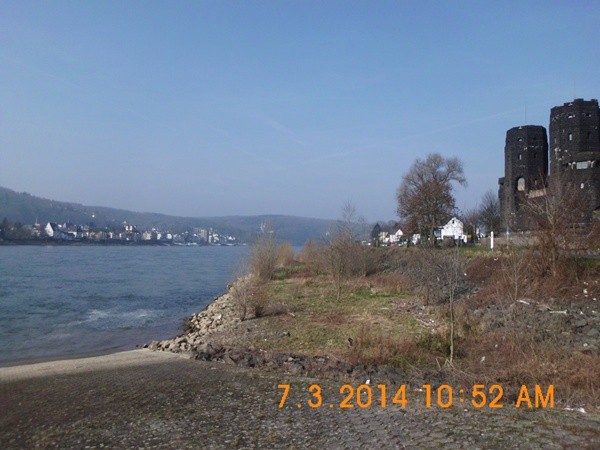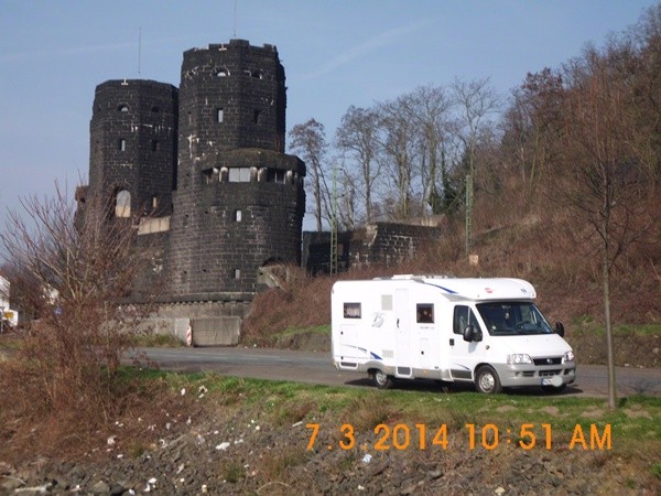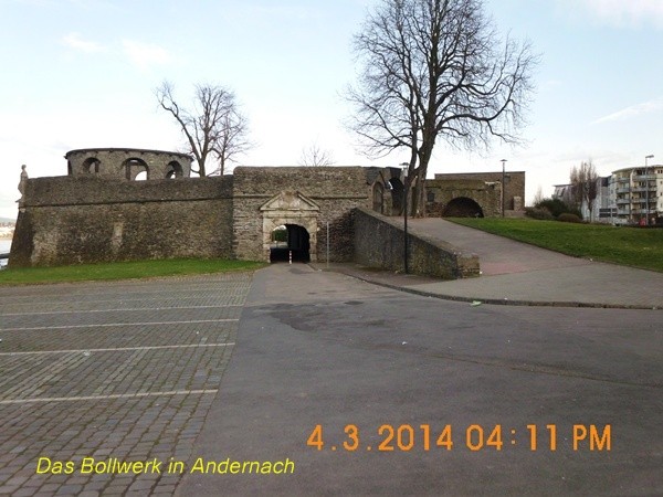 Ich platzierte das Reisemobil auf dem höher gelegenen Parkplatzteil in zweiter Reihe mit guter Sicht auf den Rhein. Vorher hatte ich an der Entsorgungsanlage noch endlich die WC-Cassette geleert. Ich stellte den Stromanschluss zum Münzautomaten her und nutzte die Pause zum Sonnen vor dem Wohnmobil. Immerhin 13 Grad zeigte das Aussenthermometer an. :D Später ging ich noch etwas am Rheinufer entlang und durch den schönen Ort Andernach. ^Das Bollwerk, eine Verteidigungsfestung direkt am Flussufer