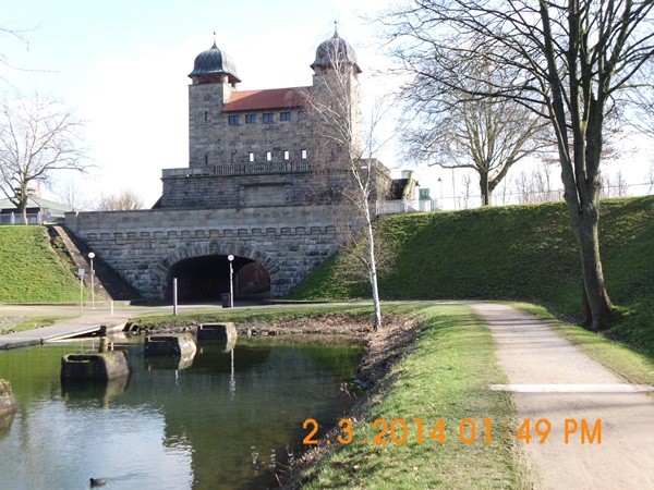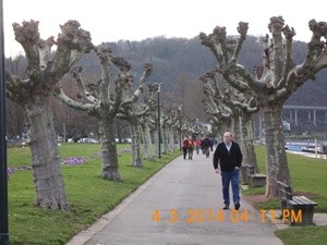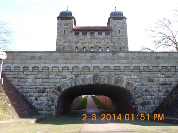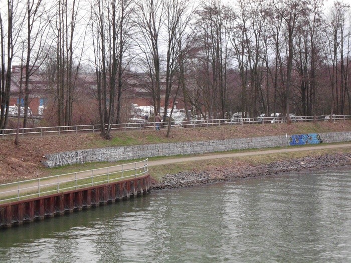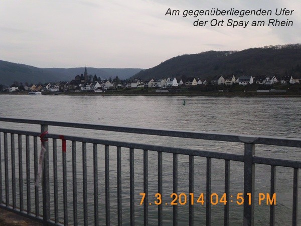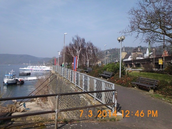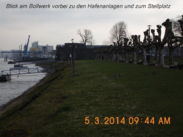 Dann kam der 5. Tag auf meiner Reise entlang des Rheines: Mittwoch, der 05. März 2014. Es war eine kühle Nacht und an diesem Morgen um etwa 07:30 Uhr zeigte das Aussenthermometer des Wohnmobils nur +4°C Grad. Gegen 08:15 Uhr kam ein Bäckerwagen auf den Stellplatz und verkaufte frische Brötchen und andere Backwaren. Nach dem Frühstück machte ich mich dann noch einmal auf den Weg zur Ortserkundung. Auch Heute ging ich wieder am Rhein auf der Uferpromenade entlang. Rückblickend an dem Bollwerk vorbei blickte ich auf den Stellplatz und die Hafenanlagen...