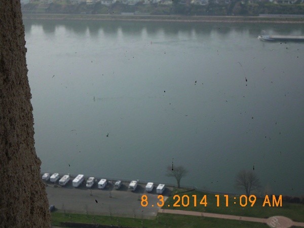 Als ich neben die Kanonen an ein Fenster trat und rausblickte, schaute ich auf den Rhein und sah den Wohnmobil-Stellplatz tief unten liegen...