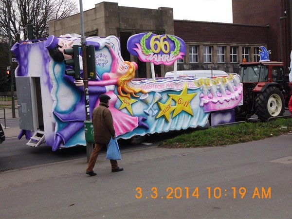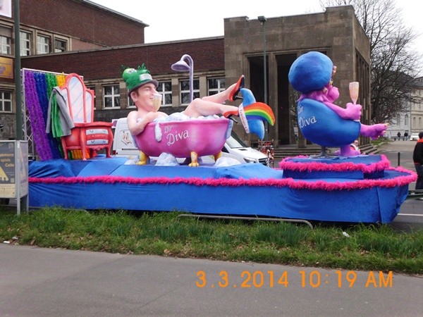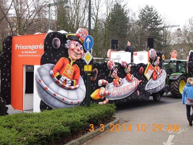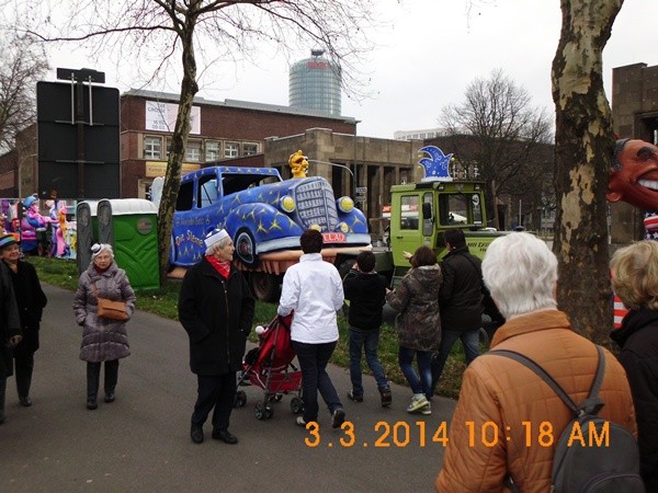 In Düsseldorf auf dem Stell-/Parkplatz am Tonhallenufer standen etwa 20 Reisemobile. Es war recht kühl an diesem Morgen, ich ging ein paar Schritte am Flussufer entlang und durch den Rheinpark, der sich ganz in Stellplatznähe befindet. In der Parallelstraße, der Josef-Beuys-Allee war schon reges Fahrzeugaufkommen; hier war die Aufstellungszone für den Rosenmontagszug. Ich schaute mir einen Teil der Wagen an.