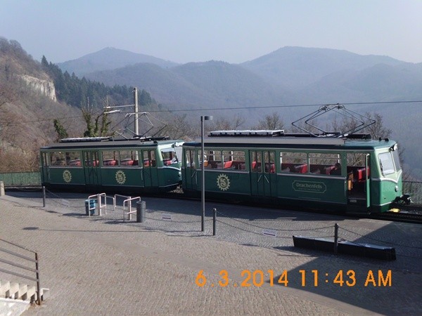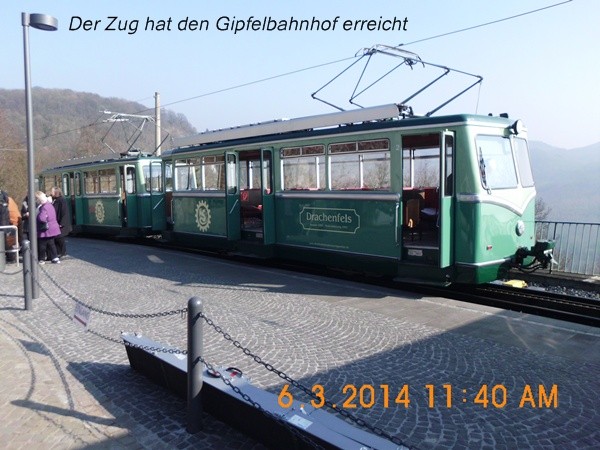 Inzwischen war der Nebel fast weg, die Sicht war gut auf die Höhen des Siebengebirges. Gleich neben dem Bahnsteig befindet sich das Gipfelrestaurant. Darüber ist auf dem Foto in der Bildmitte die Ruine der Burg Drachenfels zu erkennen...