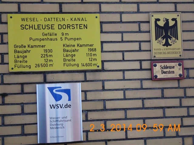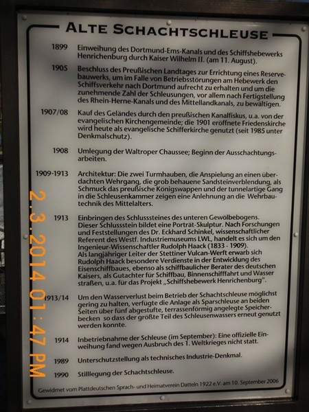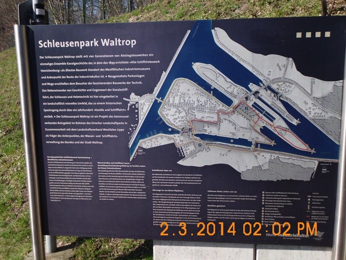 Als ich von meinem morgendlichen Spaziergang zum Stellplatz zurückkam, gab es erst einmal ein zünftiges Mittagessen aus der Bordküche. Ich hatte gestern von zuhause Kartoffelsalat mitgenommen, dazu machte ich mir Schinkenwürstchen. Dann bereitete ich das Mobil zur Weiterfahrt vor; man hat ja als Mobilist so seine unumgänglichen Arbeiten zu verrichten, Die drehbaren Sitze müssen in Fahrposition gedreht werden, das Stromkabel sollte vor der Abfahrt aus der Steckdose gezogen und aufgerollt werden :D , die Sat-Antenne muss eingefahren werden, Schranktüren und Schubladen schließen... Ja, das kann schon in Stress ausarten. :D Aber das ist für mich natürlich alles kein Problem. Ruck-Zuck war das Fahrzeug zur Weiterfahrt bereit und zu den 285 bisher gefahrenen Kilometern sollten nun weitere hinzu kommen. Ich fütterte noch schnell das Navi mit neuem Ziel: Datteln-Waltrop-Schiffshebewerk. Ich hatte im Strassenatlas den Hinweis auf das Schiffshebewerk gefunden, also hin. Bei schönem sonnigen Wetter führte mich das Navi zielstrebig über Landstrasse nach Dattel in den Ortsteil Waltrop und fand auch das Schiffshebewerk. Hier erst sah ich, daß das Hebewerk ein Museum war, welches man gegen Eintrittsgebühr besichtigen kann. Nun, besichtigen kann ich auch von außen. Aber hier gab es auch noch mehr zu sehen. Der Schleusenpark Waltrop besteht aus mehreren Schleusenanlagen... Und diese alte, inzwischen stillgelegte Schachtschleuse kann man jetzt sogar begehen.