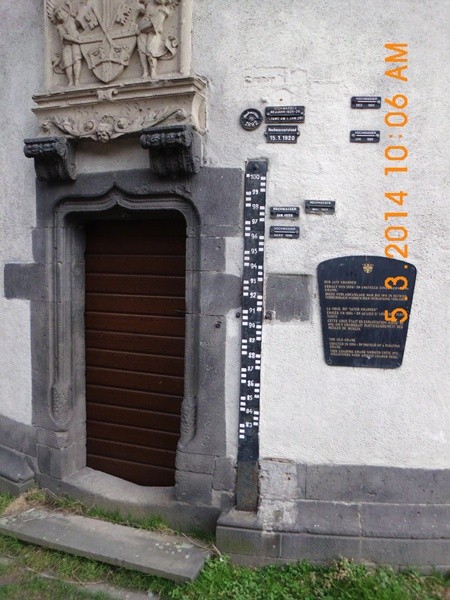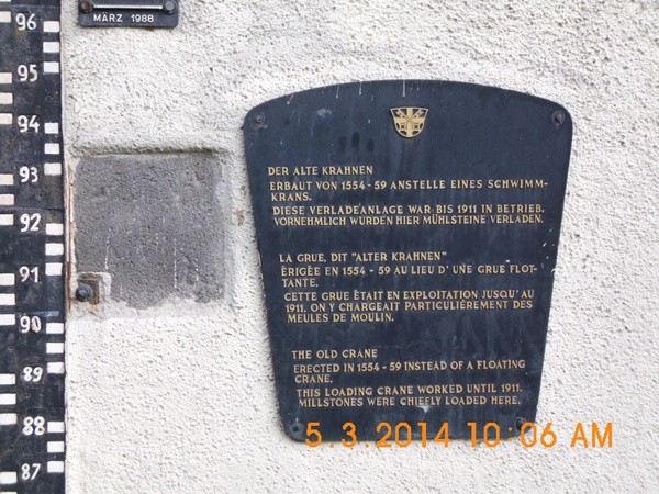 An der Aussenwand des Kranes sind die Hochwassermarken angebracht...