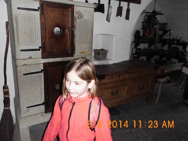 Der hohe Schrank hinter dem Mädchen ist der Kühlschrank. Hier wurden im oberen Fach Eisblöcke hinein gepackt, die z.B. im Winter aus dem Rhein hoch getragen werden mussten, und kühlten so die Lebensmittel im unteren Fach.