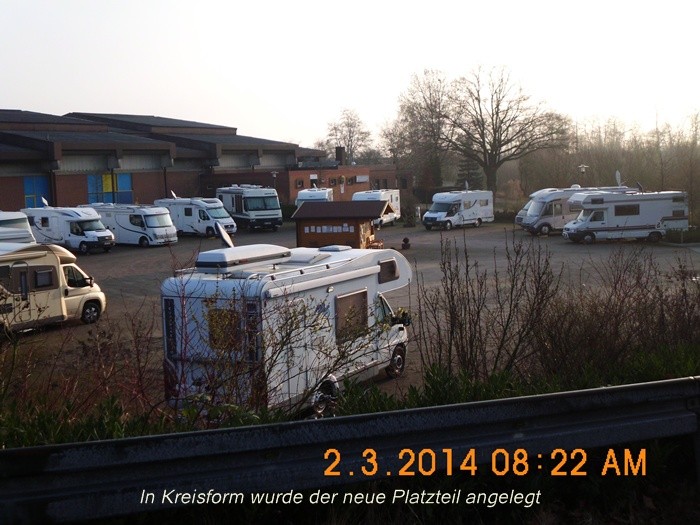 Hier kostet die Übernachtung 5,-- €, zahlbar am Automaten oder beim Platzwart. Strom kostet 1,-- € für etwa 8 Std. Direkt hinter dem Baumgürtel am alten Platzteils verläuft der Kanal.