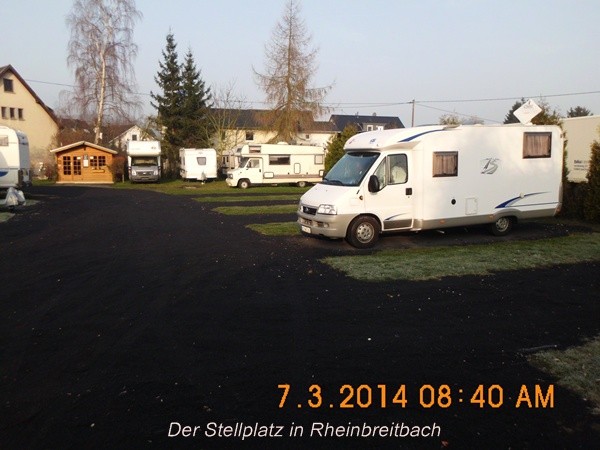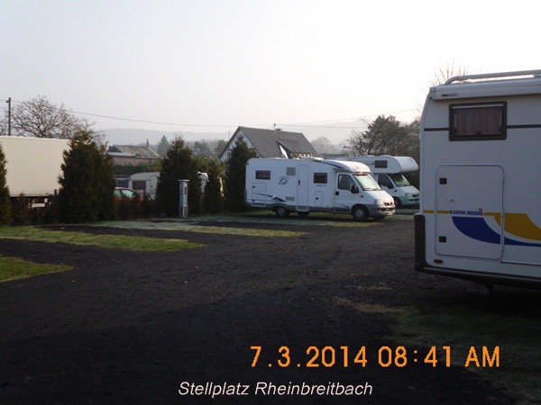 Der Stellplatz in Rheinbreitbach liegt etwas abseits vom Rhein in einem Wohngebiet im Rolandsecker Weg Nr. 8 bei einer Autowerkstatt. Der Platz kostet pro Nacht 8,-- €, zahlbar im Wohnhaus bei Familie Chrenko, und bietet 12 Fahrzeugen Platz. Je Platz steht auch eine kleine Grünflache zur Verfügung. 12 Stromanschlüsse aus 2 Münzautomaten ( ab 1,-- € ), sowie eine V+E-Anlage sind auf dem Platz.