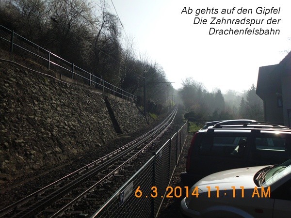 Als ich an diesem Morgen die Verdunkelungsrollos an den Fenstern öffnete, sah ich ... ..nichts :oops: . Es war dichter Nebel über Andernach. Kurz nach 8.00 Uhr fuhr der Bäckerwagen wieder klingelnd über den Stellplatz. Es gab wieder leckere Brötchen :ja: . Dann ging die Reise weiter. Bevor ich aber den Stellplatz in Andernach verließ, nutzte ich noch die Ent- und Versorgungsanlage; das Grauwasser wurde abgelassen und frisches Trinkwasser getankt. Bereits vor 8.00 Uhr hatte ich schon die WC-Cassette geleert. Bis hierher war ich schon 560 Kilometer gefahren, nun sollten weitere dazu kommen. Von Andernach fuhr ich auf der B 9 bis Weissenthurm, dann überquerte ich den Rhein, den ich wegen des dichten Nebels aber gar nicht sehen konnte. Ich sah, um ehrlich zu sein, nicht einmal das Brückengeländer. :D Über Neuwied gelangte ich dann auf der B 42 flussabwärts über Bad Hönningen und Linz am Rhein nach Königswinter. Dort stellte ich das Wohnmobil auf einen kostenpflichtigen Parkplatz nahe der Eisenbahnlinie. Nicht weit entfernt ist die Talstation der Drachenfelsbahn ... --> Link Ich kaufte eine Fahrkarte und dann brachte mich der elektrische Triebwagen auf der Zahnradspur in wenigen Minuten zum Gipfelbahnhof.