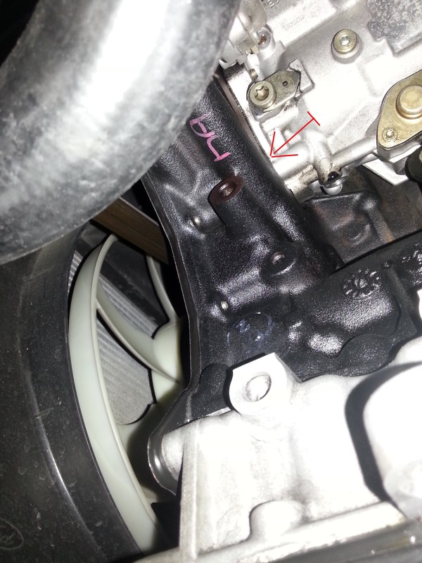 Klar sieht der sauber aus, ich habe ihn ja auch gereinigt um festzustellen wo das Öl her kommt. Schau mal unter dem roten Pfeil, da hängt ein Tropfen. Und die Dichtung auf die der Pfeil zeigt ist der Übeltäter. Der Ölaustritt ist so, dass nach ca.100 Km selbst am Ölablass der Wanne Tropfen hängen. Da verteilt sich nach relativ kurzer Fahrt einiges an Öl von der markierten Stelle nach hinten.