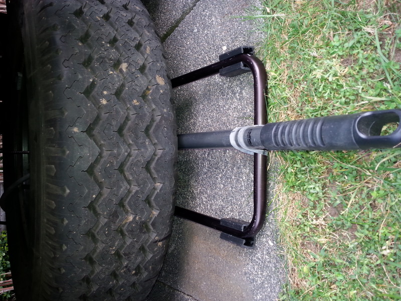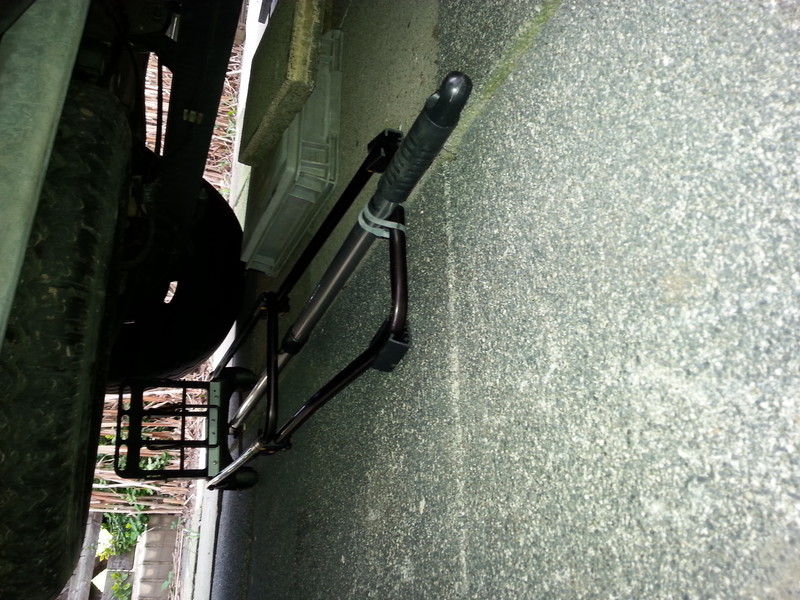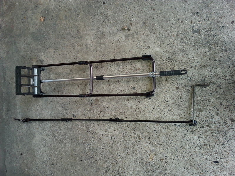 Die bereits vorhandene Kofferkarre (Alu-Leichtbauweise), die ich sonst zum Transport der Toilettenbox verwende musste zunächst für die Aufnahme des Rades etwas verstärkt werden. Dazu habe ich eine kurze Teleskopstange, die schnell an- und abgebaut werden kann, mittig befestigt.