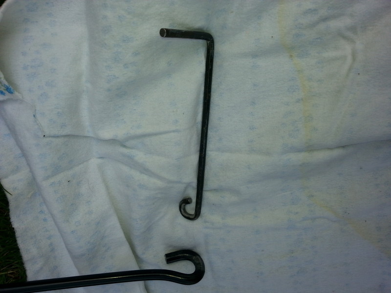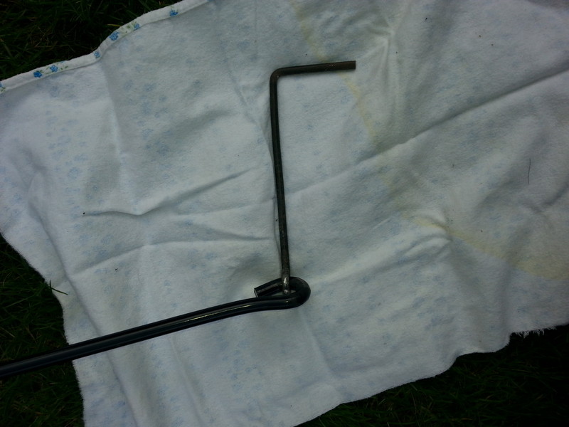 An ein Rundmetall (L250 – 300 mm, Durchm. ca.8 10 mm, stark genug um die Drehkraft aufzunehmen ohne zu verbiegen aber nicht so dick wie die Drehstange (Bordwerkzeug) einen Winkel biegen. Am anderen Ende eine Öse im Durchmesser der Drehstange (soll nicht zu locker auf der Drehstange sitzen). Auf die Öse der Drehstange aufschieben.