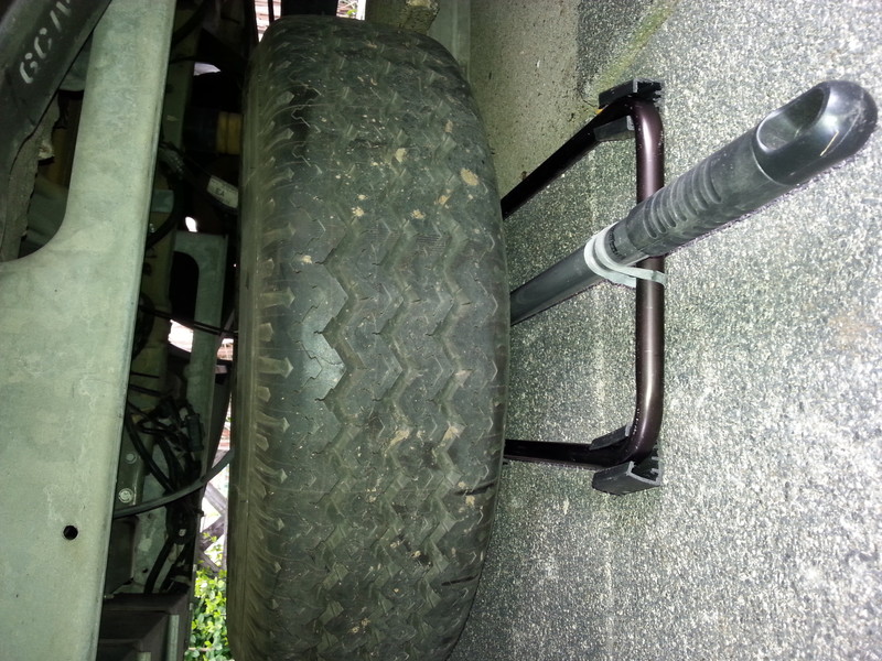 Die zweite Hilfe ist eine aufsteck bare Kurbel für die im Bordwerkzeug vorhandene Stange zum drehen der Seilrolle an dem das Rad hängt.