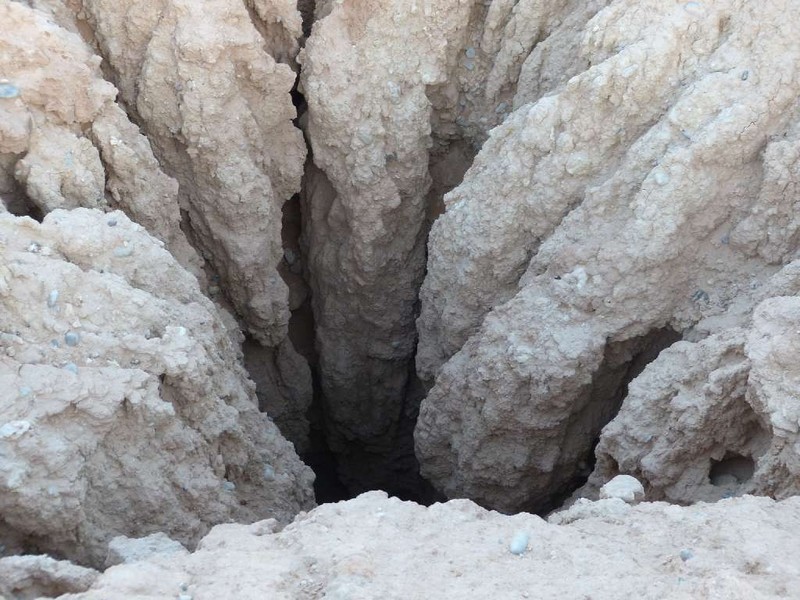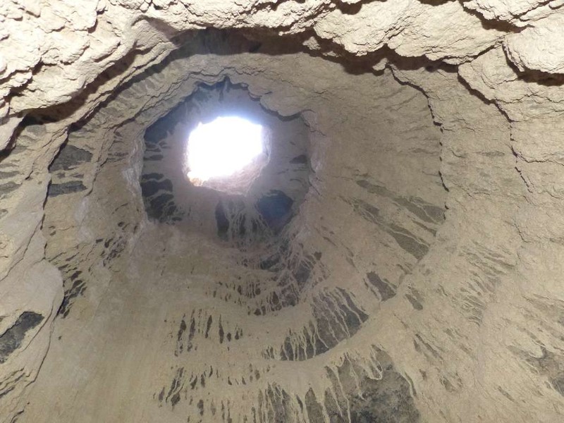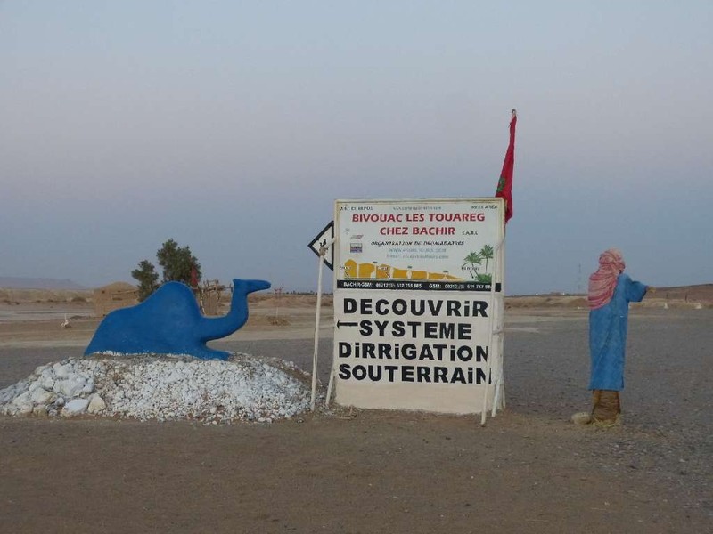 Hier bei Jorf (genau dort, wo das blaue Dromedar an der Straße steht, nicht davor und nicht dahinter) haben Hassan und seine Brüder einige Meter restauriert und den Touristen per Treppe zugänglich gemacht. Für 20 DH p.P. gibt es Tee, eine Führung, Vorführung, wie das System funktionierte, und die Übernachtung im Wohnmobil. (Eine Toilette ist auch vorhanden).