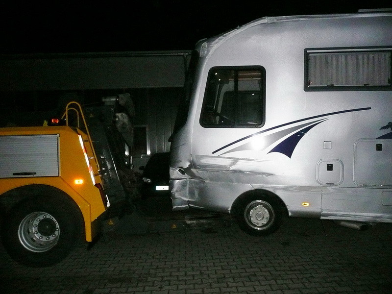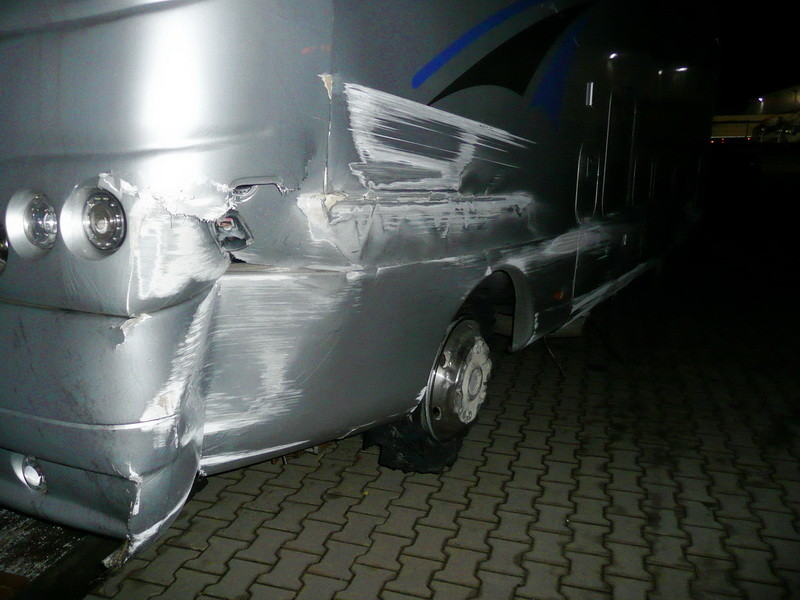 Der Einschlag links vorn an der Leitplanke war doch so heftig, daß die Befestigung der Gasflaschengurte aus dem Holz rausgerissen war, in der Heckgarage beide Spanngurte am Biketräger abgerissen waren. Dadurch war die Frontmaske, die Stoßstange und die linke Seitenwand beschädigt, zusätzlich auch die Bodenplatte unter dem Fahrersitz gebrochen … DAS wär noch nicht sooo schlimm. Aber : durch den „Streifschuß“ an der vorderen linken Dachkante (am Brückenpfeiler) hat der ganze Aufbau „eins mitgekriegt“ und hatte sich verschoben. Auch das Dach und die rechte Seitenwand war geknickt … also wäre außer dem Chassis, der Heckmaske und dem Mobiliar nix mehr zu verwenden …