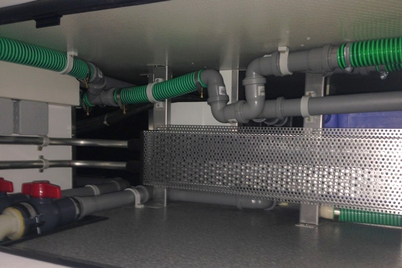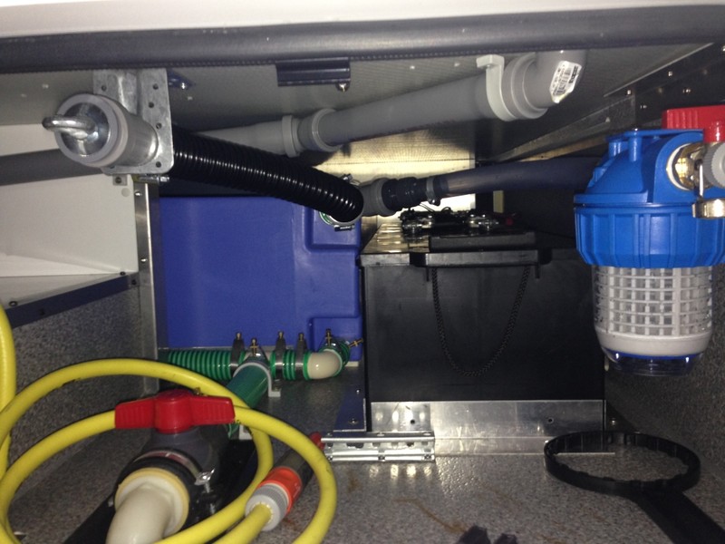 An den Frischwassertank ein Y-Stück, dann an einen großen Wasserfilter, ein Kugelhan zum absperren, und eine Gardena-Kupplung. Am anderen Ende ein HT-Rohr mit Verschlußstopfen um evtl. mal mit Gießkanne oder anderen "Notfällen" auffüllen zu können. Hierzu wird dann eine HT-Verlängerung mit Winkelstück aufgesteckt um außerhalb vom Doppelboden zu sein.