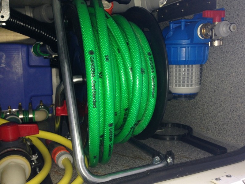 An unsere Außendusche habe ich statt der Brause einen 2m Gartenschlauch mit Gardena Stop-Kupplung und Spritze angeschlossen, damit kann ich auch Wasser in die Außenspülanschlüsse der Tanks leiten (mit Kupplungstankdeckel). Eine leere Schlauchtrommel habe ich mit 15m Gartenschlauch bestückt, jeweils Gardena Stop-Kupplung an den Enden und herausnehmbar im doppeltem Boden eingebaut. Mit dem Gartenschlauch kann ich die Außendusche rund ums Womo verlängern, oder Frischwasser tanken über den Filteranschluß. Verschiedene Wasserhahnkupplungen und "Wasserdieb" liegt bereit.