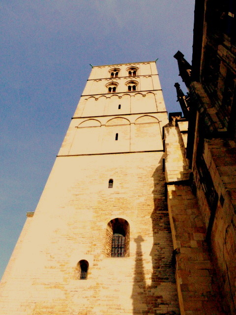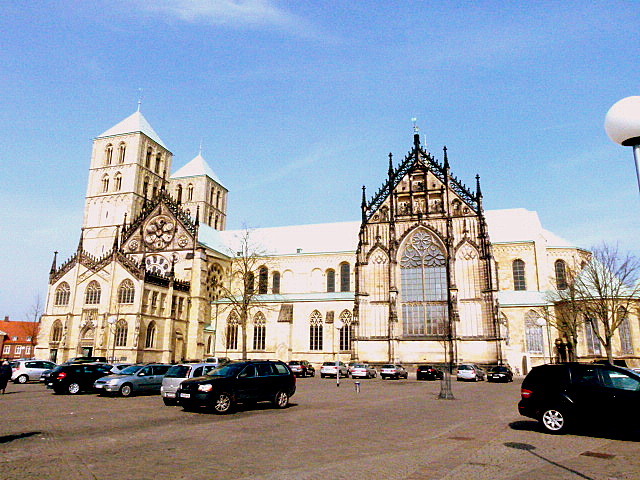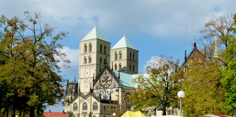 Der Paulusdom zu Münster, frisch restauriert. Mittwochs und Samstag ist Wochenmarkt vor dem Dom. Wer Zeit hat, sollte sSamstags unbedingt über den Markt schlendern. Er ist sehr groß und vielseitig, lebende Tiere, Obst, Gemüse und viele Leckereien von der Auster bis zum westfälsichen Schincken, vom holländischen Käse bis zum türkischen Köfte findet man jede kulinarische Köstlichkeit.